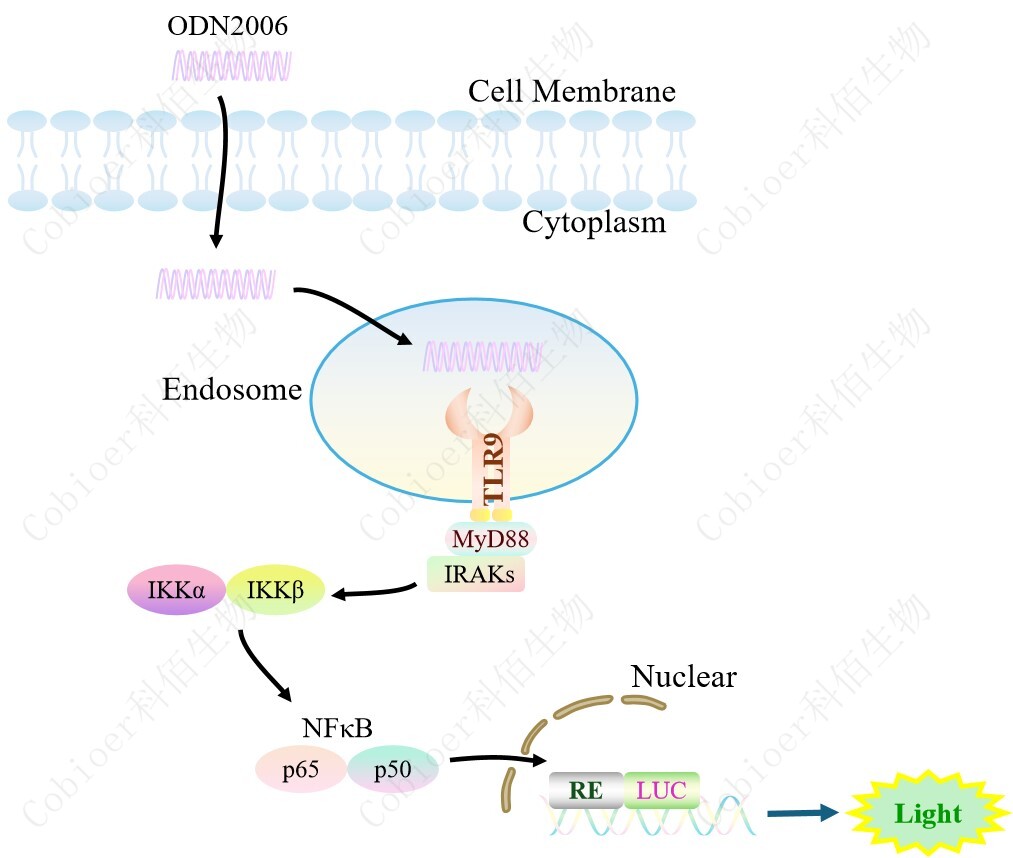 TLR9 NFκB-Luc HEK293 報告基因藥靶模型很好的模擬了體內 TLR9 的信號轉導過(guò)程, 原理見(jiàn)下圖所示。