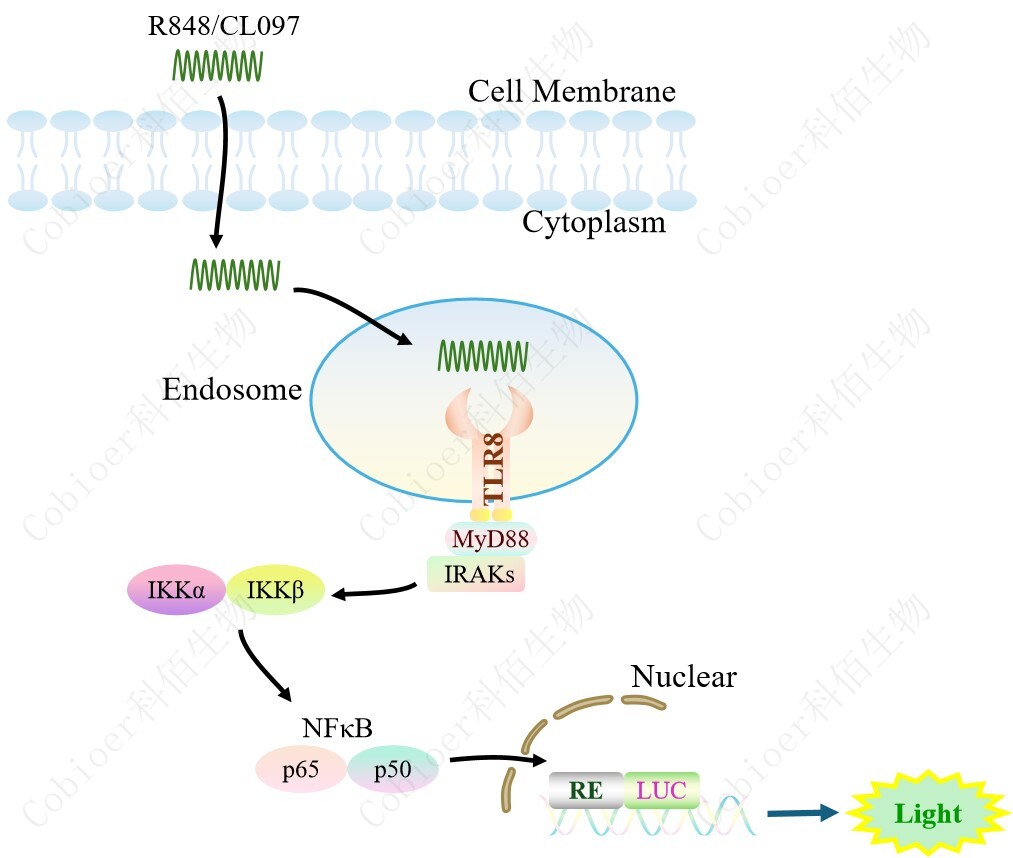 TLR8 NFκB-Luc HEK293 報告基因藥靶模型很好的模擬了體內 TLR8 的信號轉導過(guò)程, 原理見(jiàn)下圖所示。