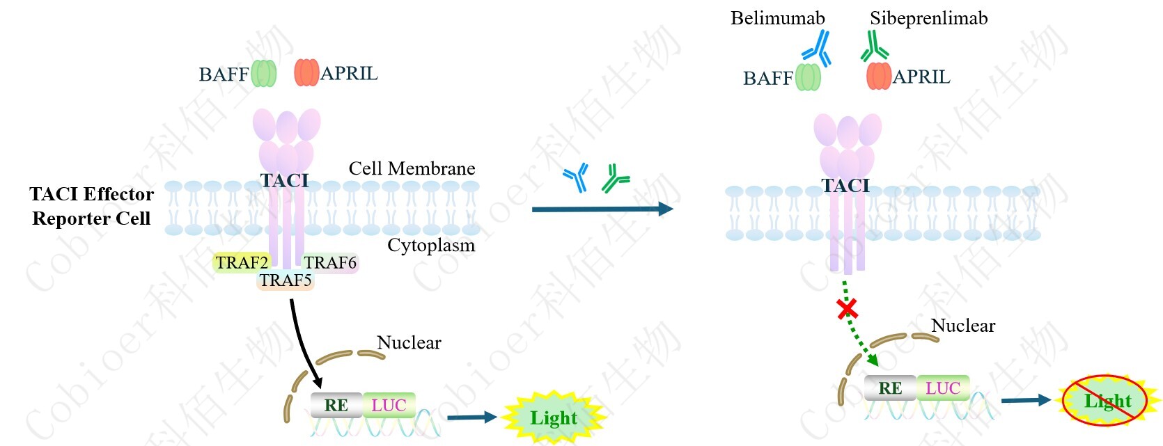 TACI Effector Reporter Cell 報告基因藥靶模型很好的模擬了體內 TACI 的信號轉導過(guò)程, 原理見(jiàn)下圖所示。![]() Figure 1. TACI Effector Reporter Cell 模型原理圖 |