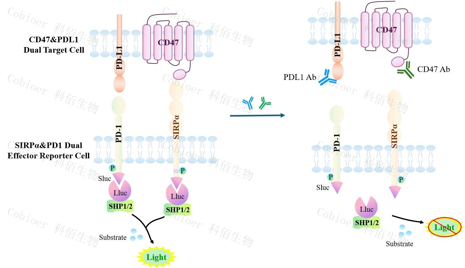 SIRPα&PD1 Dual Effector Reporter Cell 報 告 基 因 藥 靶 模 型 很 好 的 模 擬 了 體 內 SIRPα&PD1 的信號轉導過(guò)程,原理見(jiàn)下圖所示。