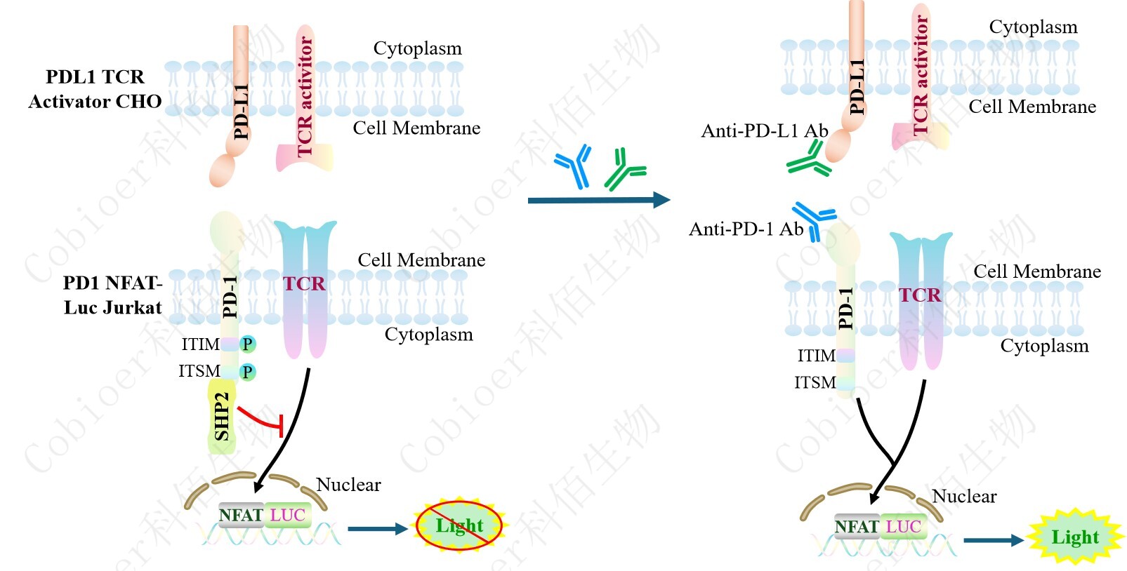 PDL1 TCR Activator CHO 細胞作為 PD1 NFAT-Luc Jurkat 細胞的靶細胞,很好的模擬了 體內 PD1&PDL1 的信號轉導過(guò)程,原理見(jiàn)下圖所示。