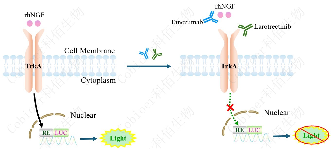 NGF/TRKA Effector Reporter Cell 報告基因藥靶模型很好的模擬了體內 NGF/TRKA 的 信號轉導過(guò)程,原理見(jiàn)下圖所示。