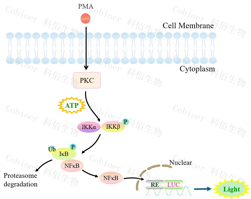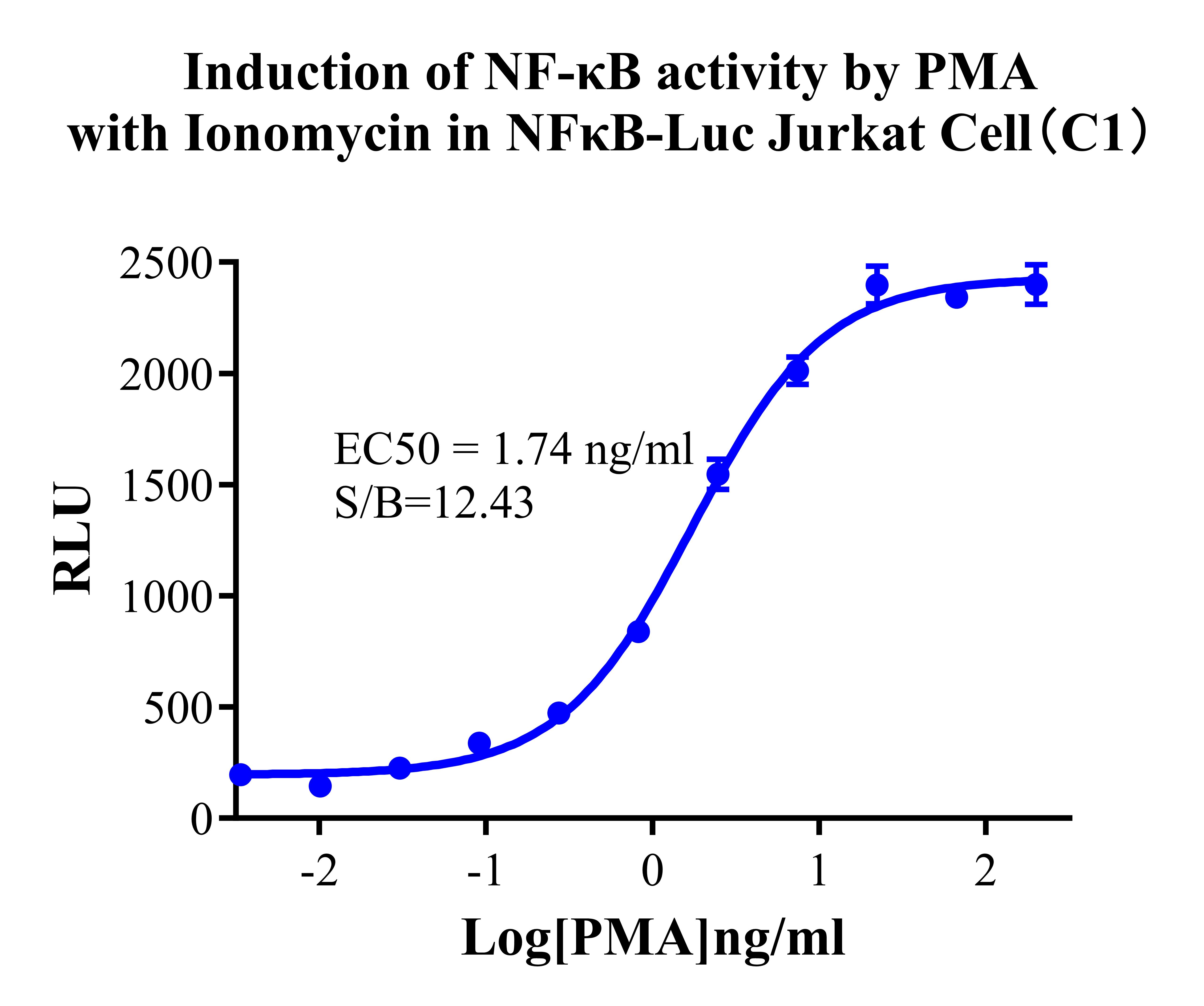 NFκB-Luc Jurkat 報告基因細胞是由 NFκB 調控并表達 Luc 熒光素酶報 告基因的 Jurkat細胞。PMA 是 DAG(二酯酰甘油)的類(lèi)似物,可自由的通過(guò)細胞膜,直接 作用于細胞活化信號轉導通路上的 PKC,原理見(jiàn)下圖所示。![]() Figure 1:NFκB-Luc Jurkat 細胞模型原理圖