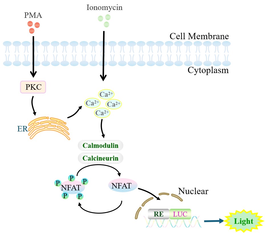 NFAT-Luc Jurkat 報告基因藥靶模型很好的模擬了體內 NFAT 的信號轉導過(guò)程,原理見(jiàn) 下圖所示。