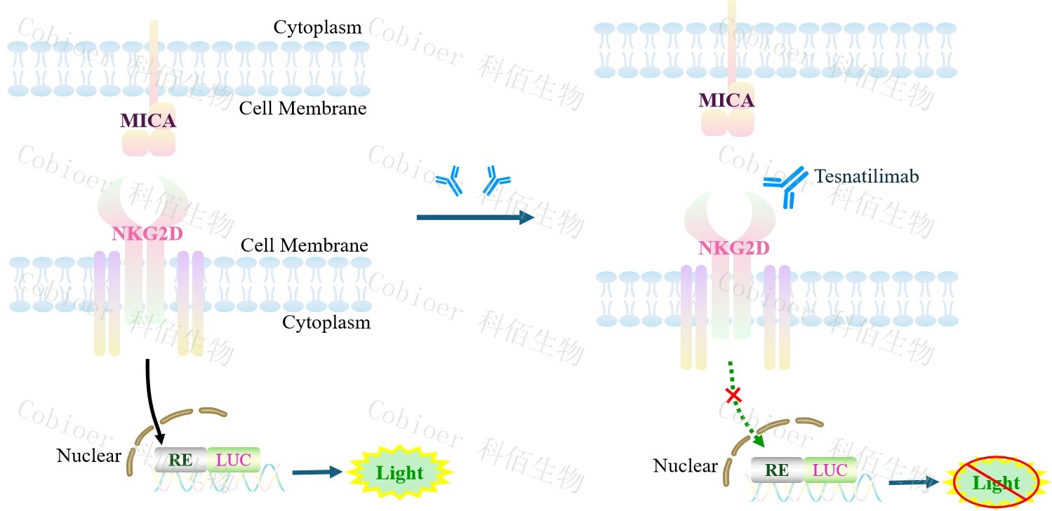MICA CHO 作為 NKG2D Effector Reporter Cell 的靶細胞,很好的模擬了體內 NKG2D 的信號轉導過(guò)程,原理見(jiàn)下圖所示。![]() Figure 1. MICA CHO 細胞構建原理圖 |