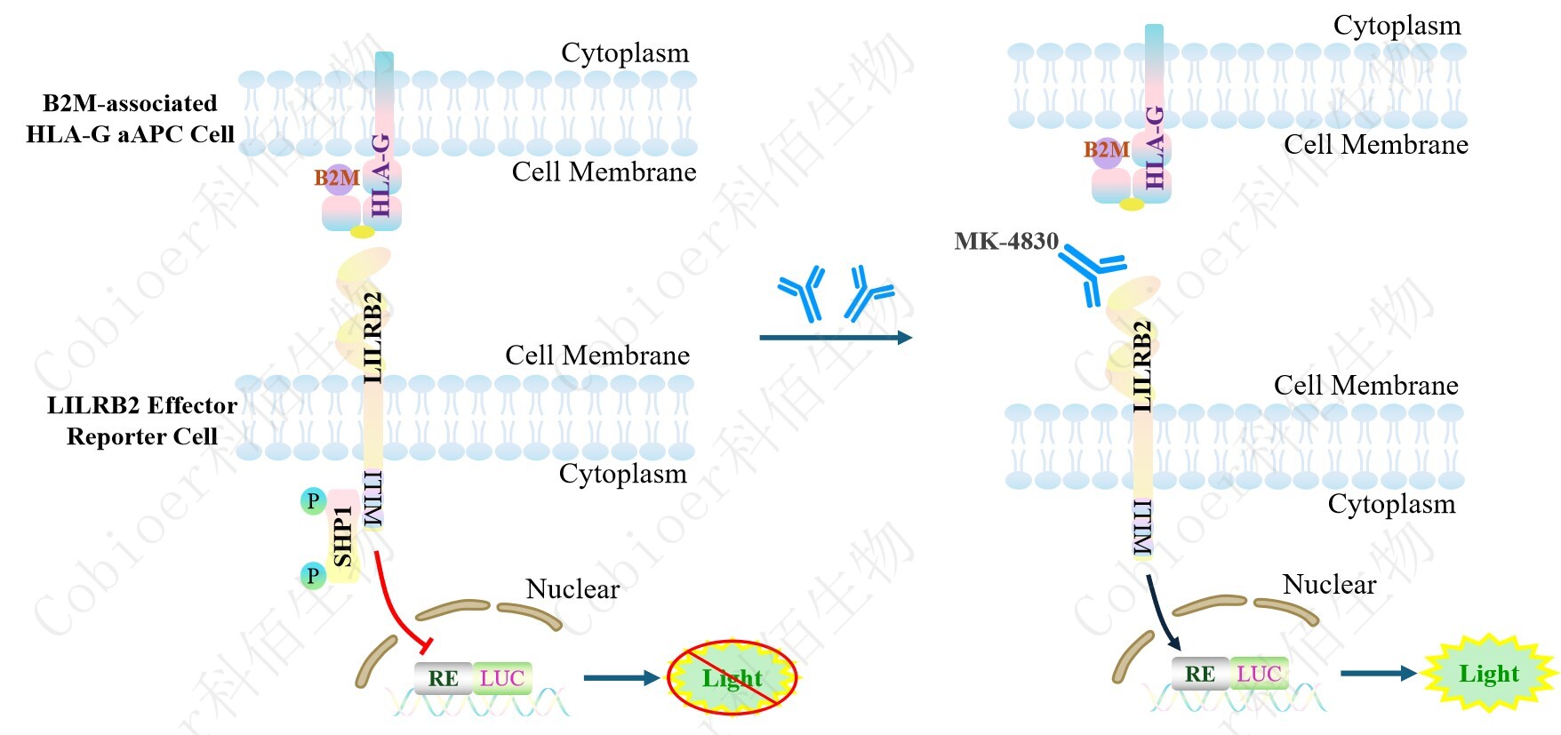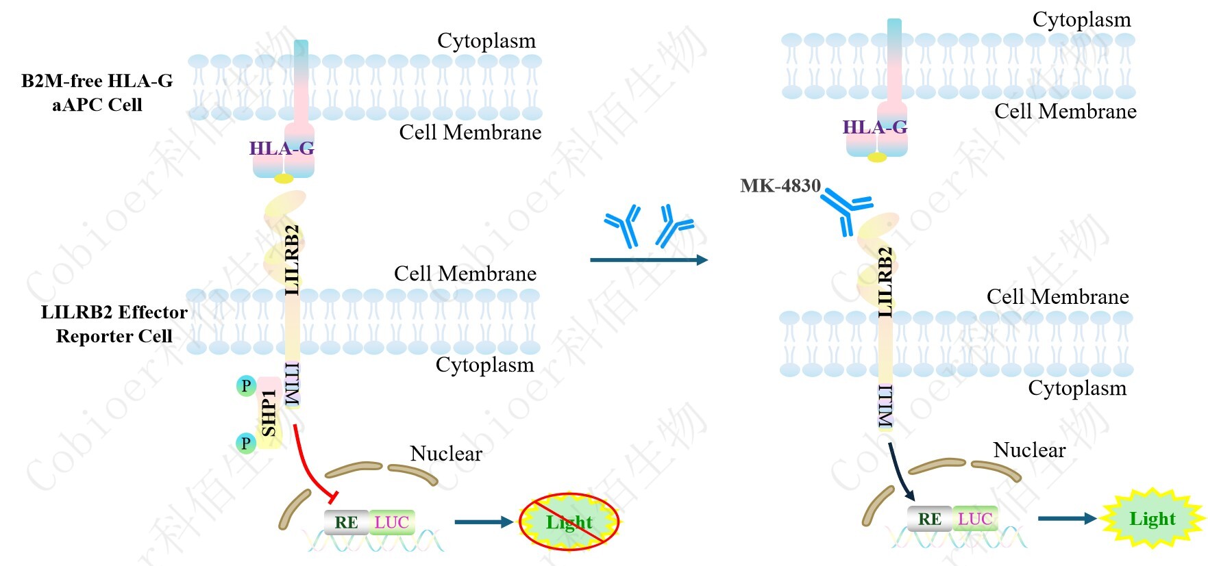 LILRB2 Effector Reporter Cell 報告基因藥靶模型很好的模擬了體內 LILRB2 的信號轉導過(guò)程,原理見(jiàn)下圖所示。![]() ![]() Figure 1. LILRB2 Effector Reporter Cell 模型原理圖 |