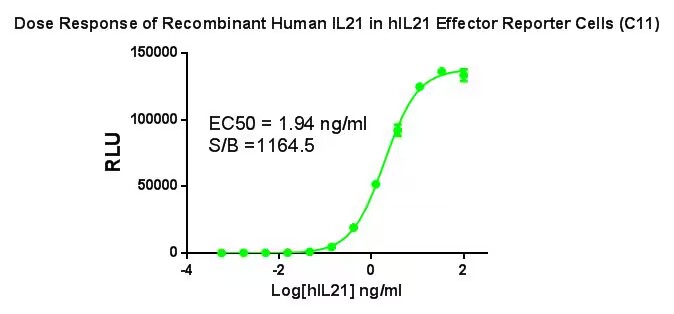 Figure 2.Dose Response of Recombinant Human IL21 in hlL21 Effector Reporter Cells (C11). |