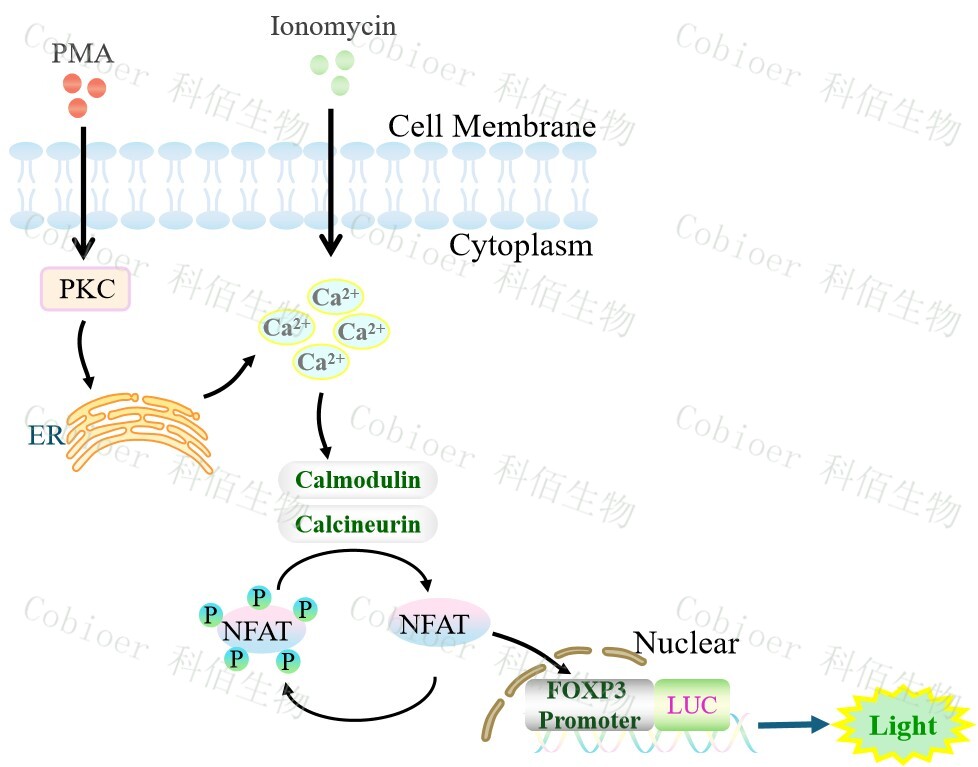 FOXP3 promoter-Luc Jurkat 報告基因細胞,是由 FOXP3 調控并表達 Luc 熒光素酶報告基因的 Jurkat 細胞。PMA 是 DAG(二酯酰甘油)的類(lèi)似物,可自由的通過(guò) 細胞膜,可用于測定 CD3/CD28 介導的 T 細胞活化,原理見(jiàn)下圖所示。