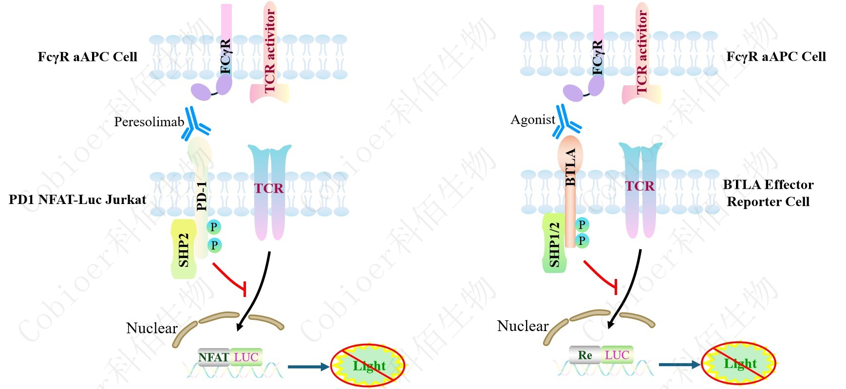 FcγR aAPC Cell在基礎細胞上穩定表達 FcγR 和 aAPC。FcγR aAPC Cell 作為 PD1 NFAT-Luc Jurkat Cell/BTLA Effector Reporter Cell 的靶細胞進(jìn)行功能檢測的原 理圖見(jiàn)下圖所示。![]() Figure 1. FcγR aAPC Cell 的原理圖 |