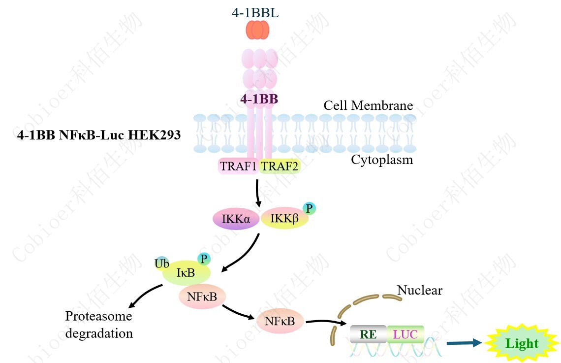 4-1BB NFκB-Luc HEK293 報告基因藥靶模型很好的模擬了體內 4-1BB 的信號轉導過(guò)程, 原理見(jiàn)下圖所示。 Figure 1. 4-1BB NFκB-Luc HEK293 細胞模型原理圖