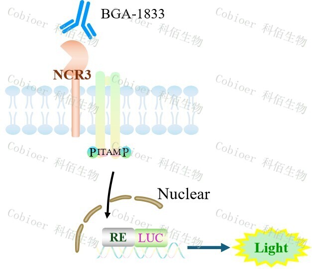 NCR3(NKp30) Effector Reporter 報告基因藥靶模型很好的模擬了體內 NKp30 的信號 轉導過(guò)程,原理見(jiàn)下圖所示。![]() Figure 1. NCR3(NKp30) Effector Reporter 細胞模型原理圖 |
