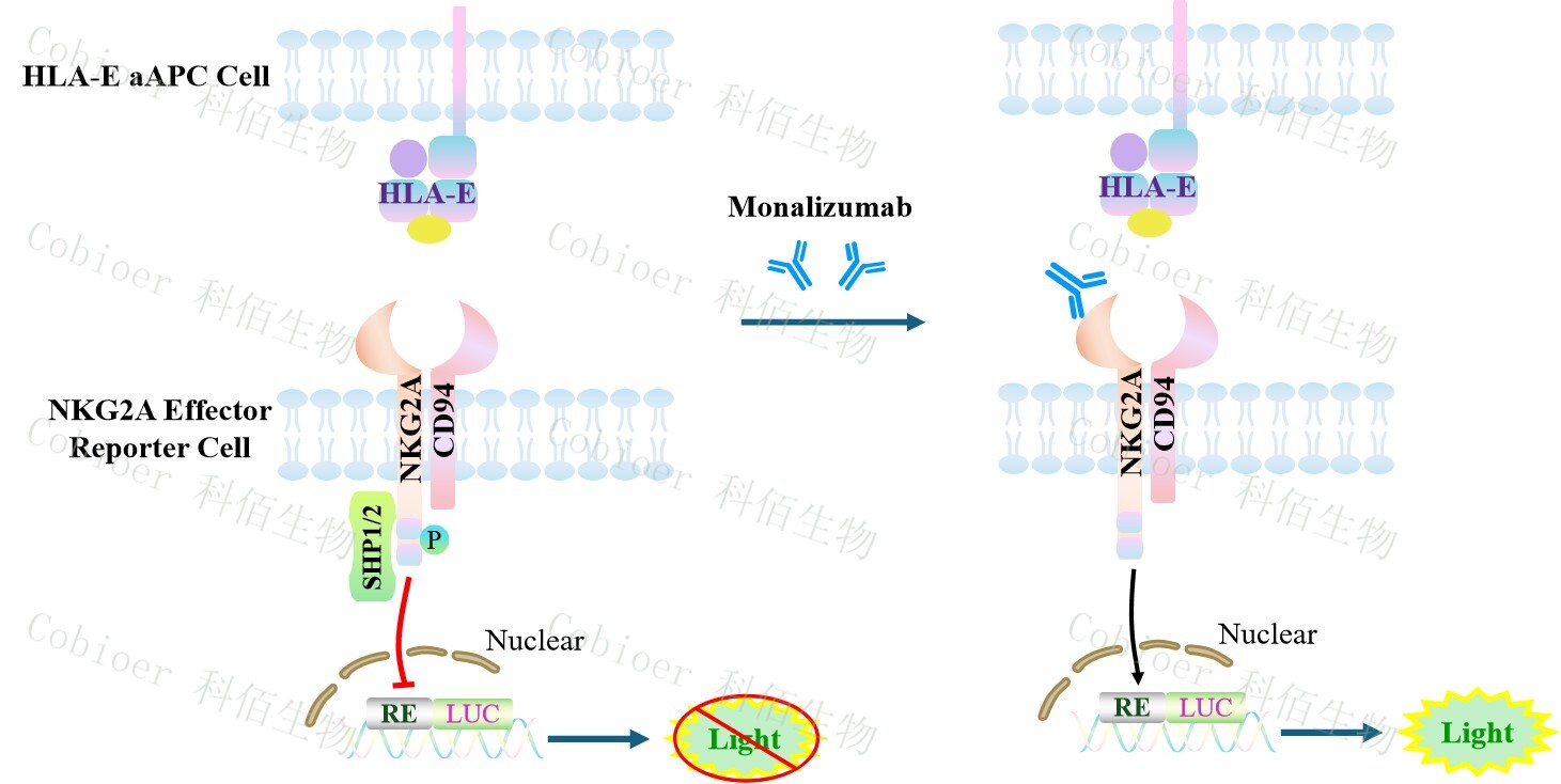 HLA-E aAPC Cell 作為 NKG2A Effector Reporter Cell 的靶細胞,很好的模擬了體內 NKG2A &HLA-E 的信號轉導過(guò)程,原理見(jiàn)下圖所示。 ![]() Figure 1. HLA-E aAPC Cell 細胞模型原理圖 |