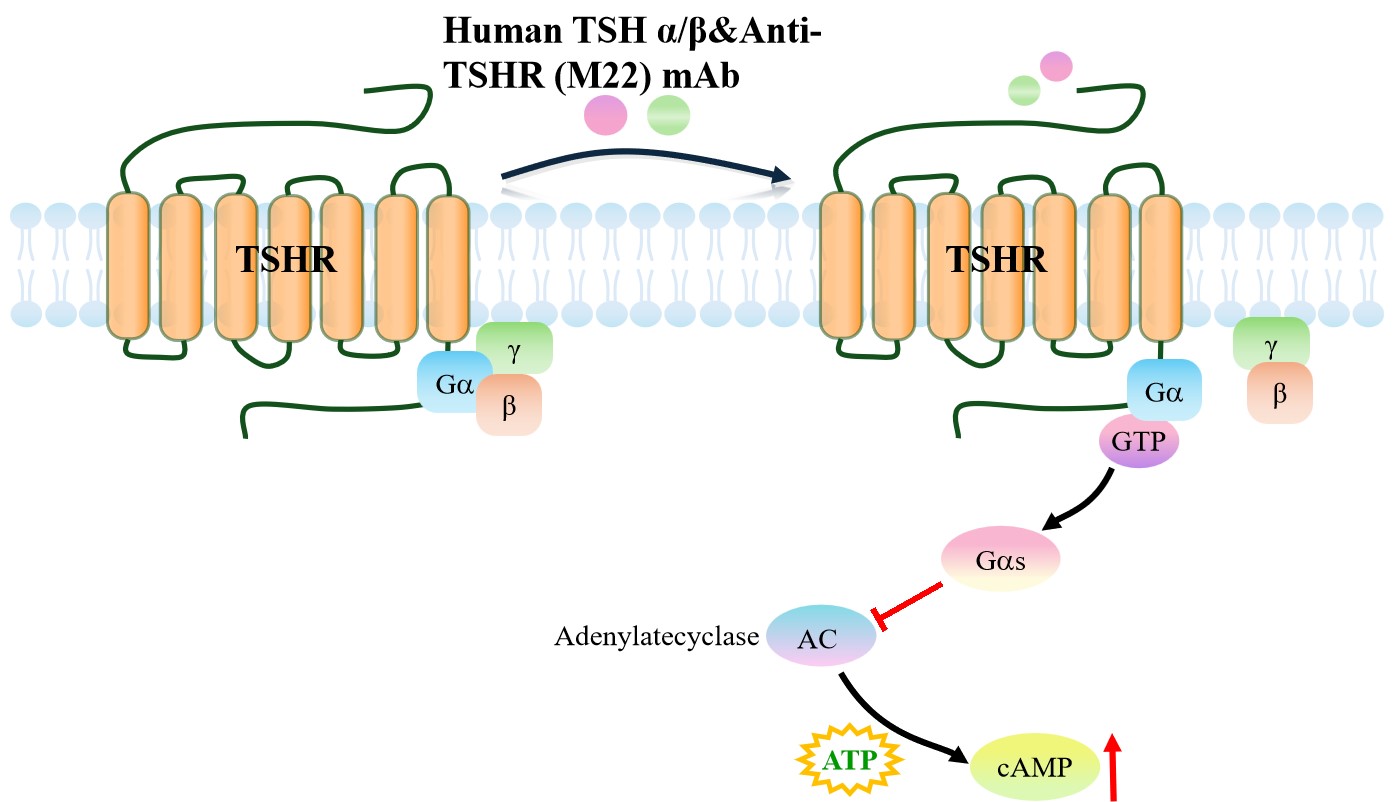 cAMP 在 G 蛋白偶聯(lián)受體(GPCR)信號轉導中是一種關(guān)鍵的第二信使。當配體結合 到 GPCR,構象發(fā)生變化,激活受體接著(zhù)激活 G 蛋白,Gs 的激活導致腺苷酸環(huán)化酶調控 cAMP 的升高。TSHR 藥靶模型很好的模擬了體內 TSHR 的信號轉導過(guò)程,原理見(jiàn)下圖所示。 |