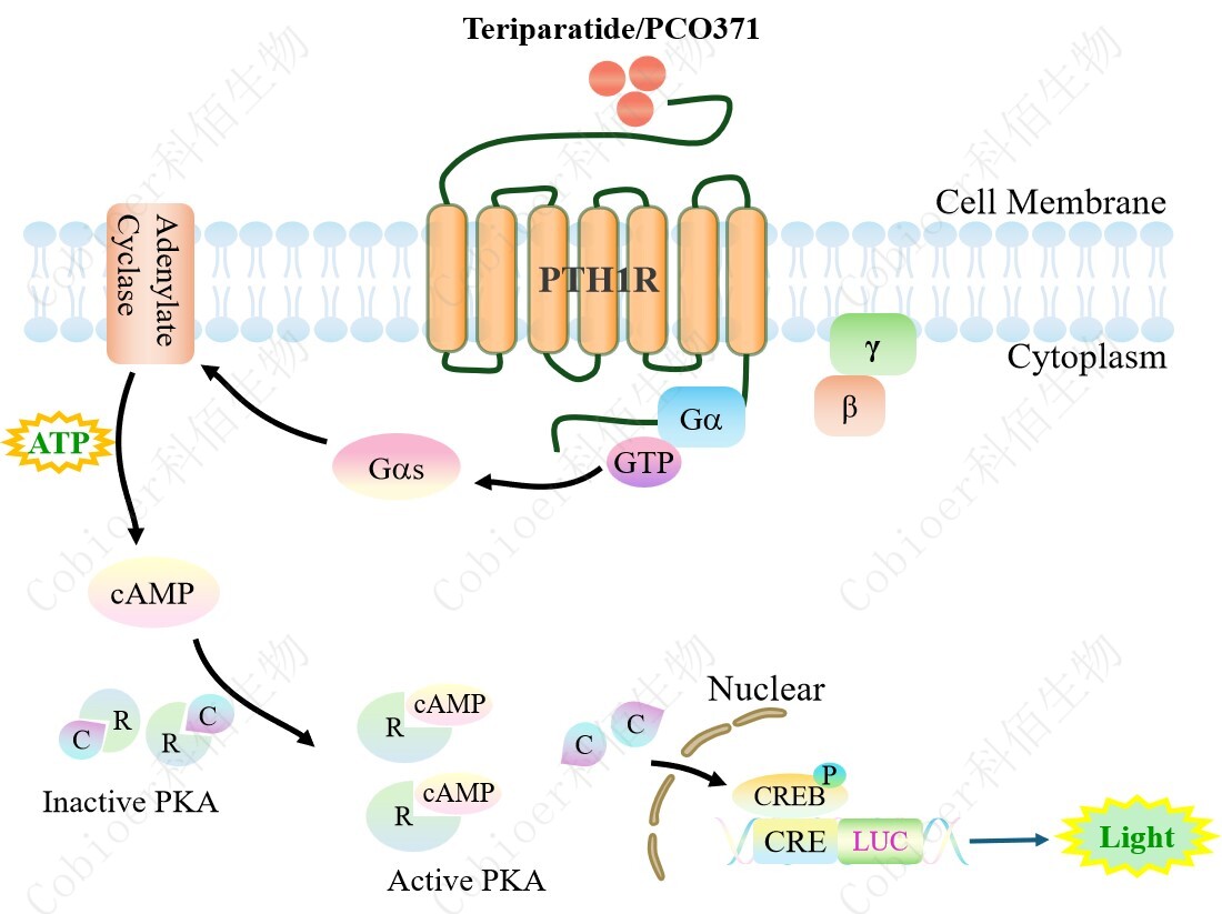 PTH1R CRE-Luc HEK293 報告基因藥靶模型很好的模擬了體內 PTH1R 的信號轉導過(guò)程,原理見(jiàn)下圖所示。 ![]() Figure 1. PTH1R CRE-Luc HEK293 細胞模型原理圖 |