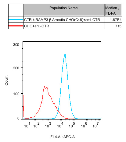 IV. Representative Data![]() Figure 2. WB of CTR&RAMP3 β-Arrestin CHO. ![]() Figure 3. Recombinant CTR&RAMP3 β-Arrestin CHO stably expressing CTR. ![]() |