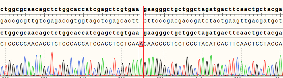 Figure 2. ACVR2A Effector Reporter Cell 測序結果 ACVR2B(NM_001106.4): c.221_222insA/ACVR2B:p.K74Kfs*7