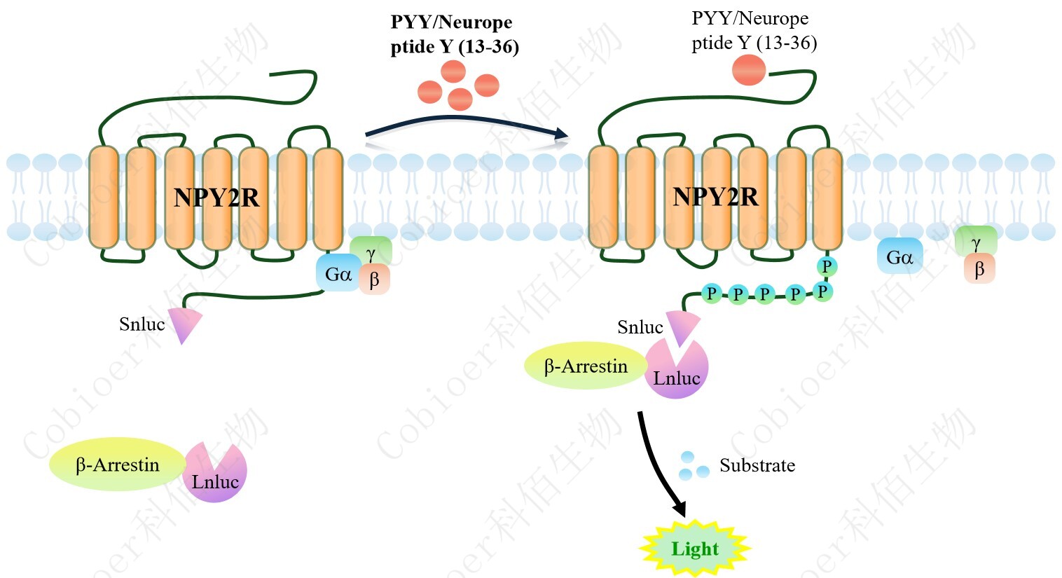 NPY2R β-Arrestin CHO 報告基因藥靶模型很好的模擬了體內 NPY2R/β-Arrestin 的信號 轉導過(guò)程,原理見(jiàn)下圖所示。當缺乏配體刺激時(shí),β-Arrestin 不與 NPY2R 結合,融合β- Arrestin 的熒光素酶處于失活構象,當 NPY2R 遭遇配體刺激時(shí),融合熒光素酶報告基因的β-Arrestin 被招募,使熒光素酶報告基因處于激活狀態(tài),加入其底物后發(fā)光信號增強。