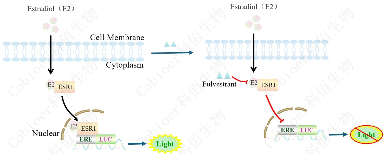 ESR1 ERE-Luc Hela Cell,是由 ERE 調控并表達 Luc 熒光素酶報告基因 的 Hela 細胞。β-雌二醇(17β-Estradiol,E2)是人體內活性最強的雌激素,主要通過(guò)結合 ER 發(fā)揮作用,調控基因表達和細胞功能,原理見(jiàn)下圖所示。![]() Figure 1. ESR1 ERE-Luc Hela Cell 原理示意圖 |