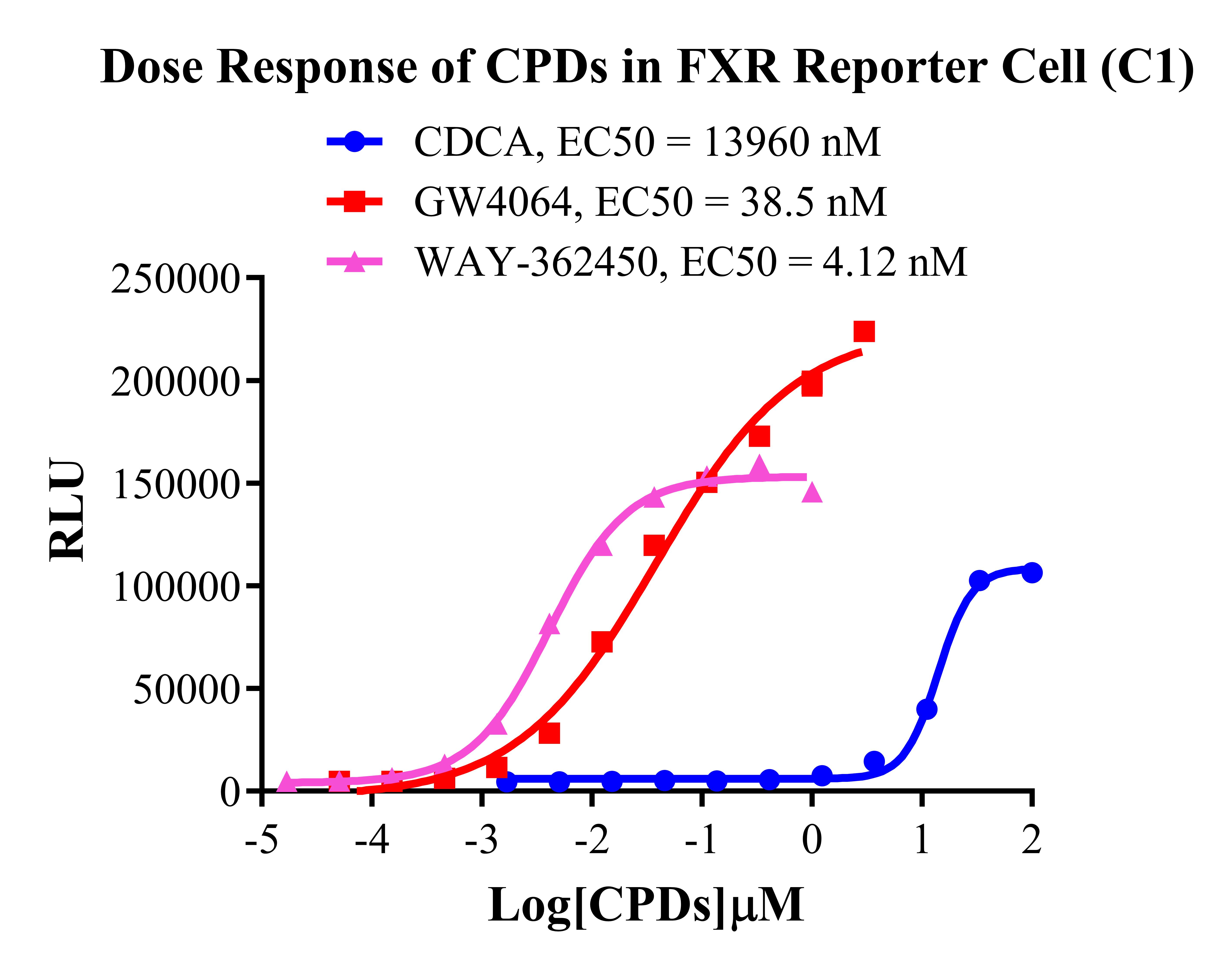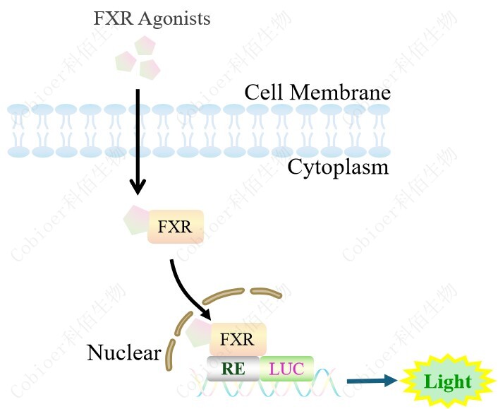 FXR Reporter Cell 報告基因細胞,在由調控因子調控并表達報告基因的 重組細胞上,穩定表達人 FXR。CDCA,GW4064 和 WAY-362450 是 FXR 的激活劑,原理見(jiàn)下圖所示。![]() Figure 1. FXR Reporter Cell 細胞原理示意圖 |
