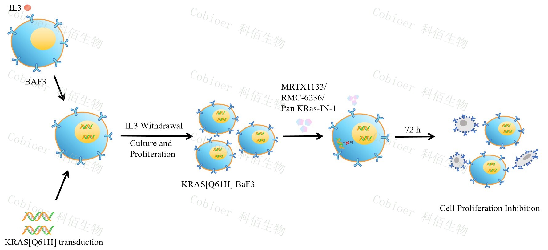 BaF3(小鼠原 B 細胞)的生長(cháng)和增殖需要 IL-3 的維持。通過(guò)引入各種表達激酶的基因, 能作為 BaF3 的驅動(dòng)基因,讓 BaF3 不再依賴(lài) IL-3 而增殖,進(jìn)而激酶基因成為 BaF3 增殖依 賴(lài)的驅動(dòng)基因,用于評估小分子藥物對激酶的靶向抑制作用,原理及流程見(jiàn)下圖所示。