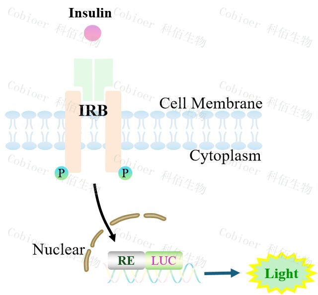 IRB Effector Reporter Cell 報告基因藥靶模型很好的模擬了體內 Insulin 的信號轉導過(guò)程, 原理見(jiàn)下圖所示。