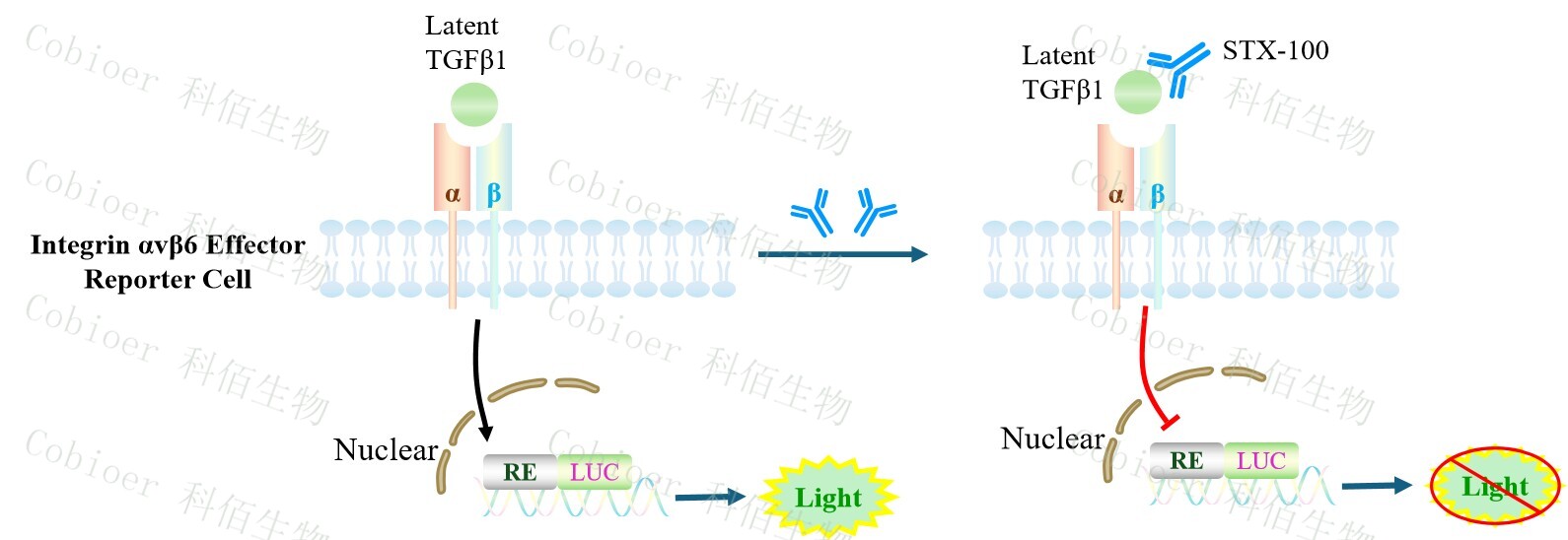 Integrin αvβ6 Effector Reporter Cell 報告基因藥靶模型很好的模擬了體內αvβ6 的信號轉 導過(guò)程,原理見(jiàn)下圖所示。