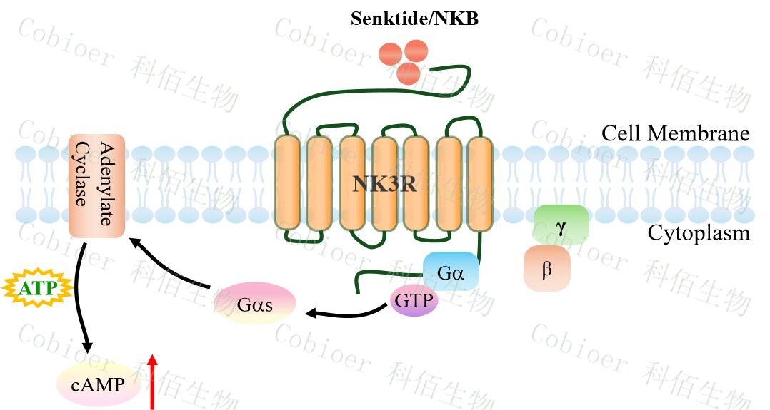 | 速激肽(Tachykinin)是在整個(gè)神經(jīng)和免疫系統中表達的神經(jīng)肽,作為興奮性神經(jīng)遞質(zhì), 它們在調節各種生理功能中發(fā)揮重要的作用。在不同的速激肽中,P 物質(zhì)(SP)、神經(jīng)激 肽 A(NKA) 和 NKB 已得到充分研究。這些肽可以通過(guò)三種不同的 GPCR、神經(jīng)激肽 1 受體(NK1R)、神經(jīng)激肽 2 受體(NK2R) 和 NK3R 發(fā)揮作用。作為具有不同親和力的 完全激動(dòng)劑。 NK3R(Neurokinin 3 Receptor),又稱(chēng) TACR3,是速激肽受體家族的重要成員,屬于 GPCR 超家族。其內源性配體為神經(jīng)激肽 B(Neurokinin B, NKB),通過(guò)激活下游信號通 路參與生殖調控、神經(jīng)內分泌調節及多種疾病進(jìn)程。近年來(lái),NK3R 成為治療更年期癥狀、 神經(jīng)精神疾病及癌癥的熱門(mén)靶點(diǎn)。 |