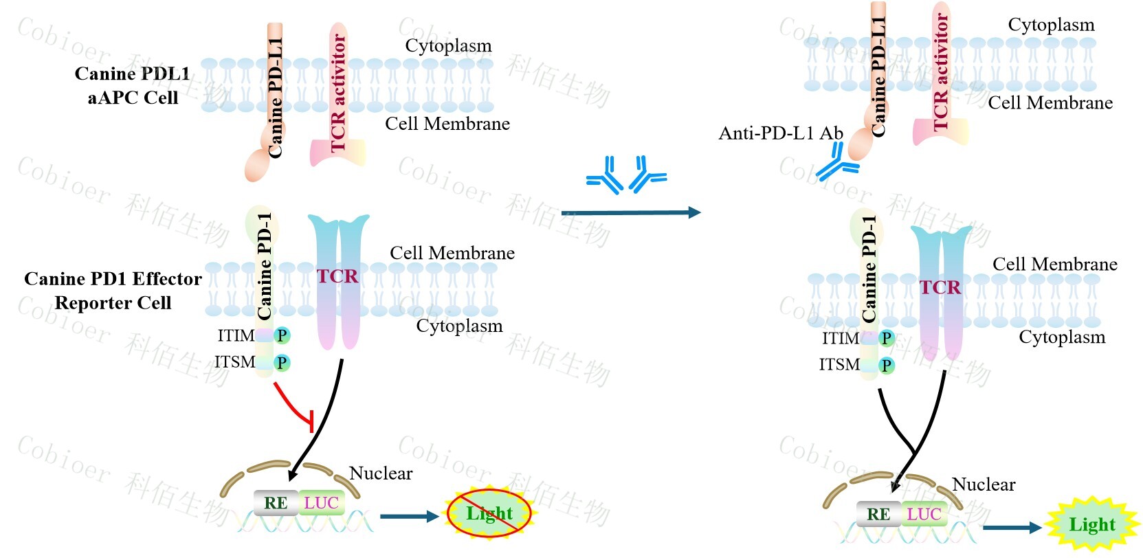 Canine PDL1 aAPC Cell 作為 Canine PD1 Effector Reporter Cell 的靶細胞,Canine PDL1 aAPC Cell 藥靶模型很好的模擬了體內 PD1&PDL1 的信號轉導過(guò)程,原理見(jiàn)下圖所示。
