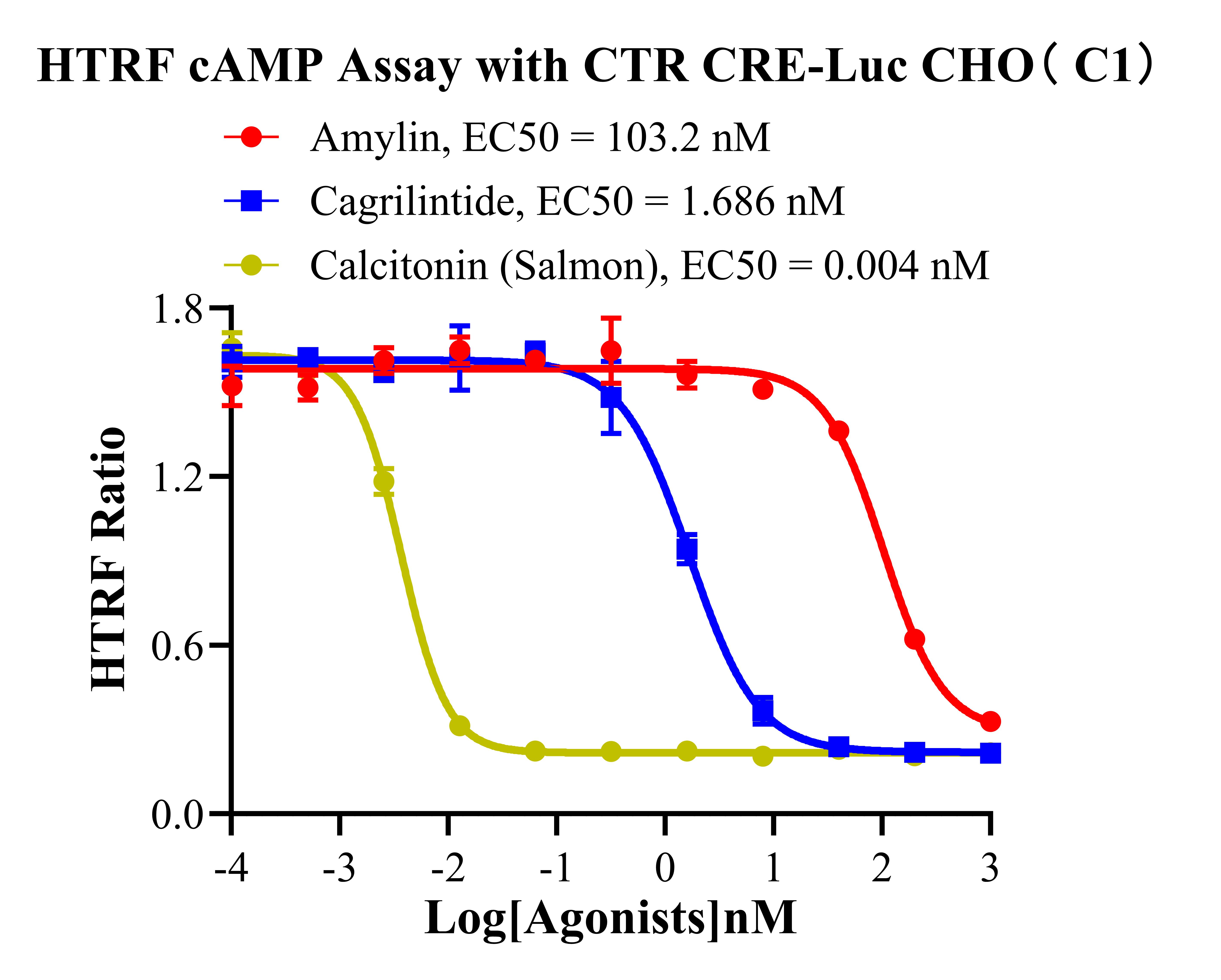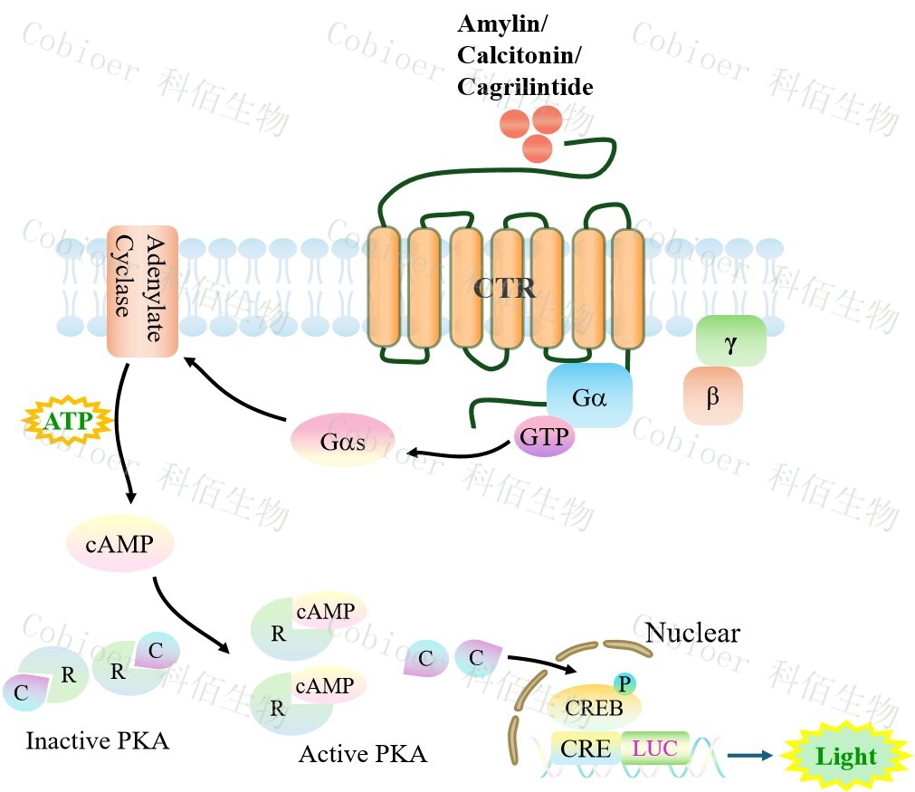 CTR CRE-Luc CHO 報告基因藥靶模型很好的模擬了體內 CTR 的信號轉導過(guò)程,原理見(jiàn)下圖所示。![]() Figure 1. CTR CRE-Luc CHO 細胞模型原理圖 |