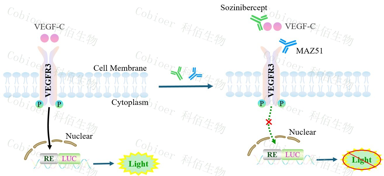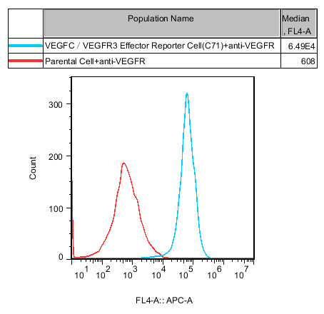 VEGFC/VEGFR3 Effector Reporter Cell 報告基因藥靶模型很好的模擬了體內 VEGFC/VEGFR3 的信號轉導過(guò)程,原理見(jiàn)下圖所示。![]() Figure 1. VEGFC/VEGFR3 Effector Reporter Cell 細胞模型原理圖 |