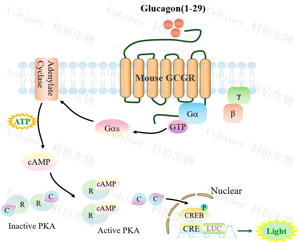 Mouse GCGR CRE-Luc HEK293 報告基因藥靶模型很好的模擬了體內 GCGR 的信號轉導過(guò)程,原理見(jiàn)下圖所示。