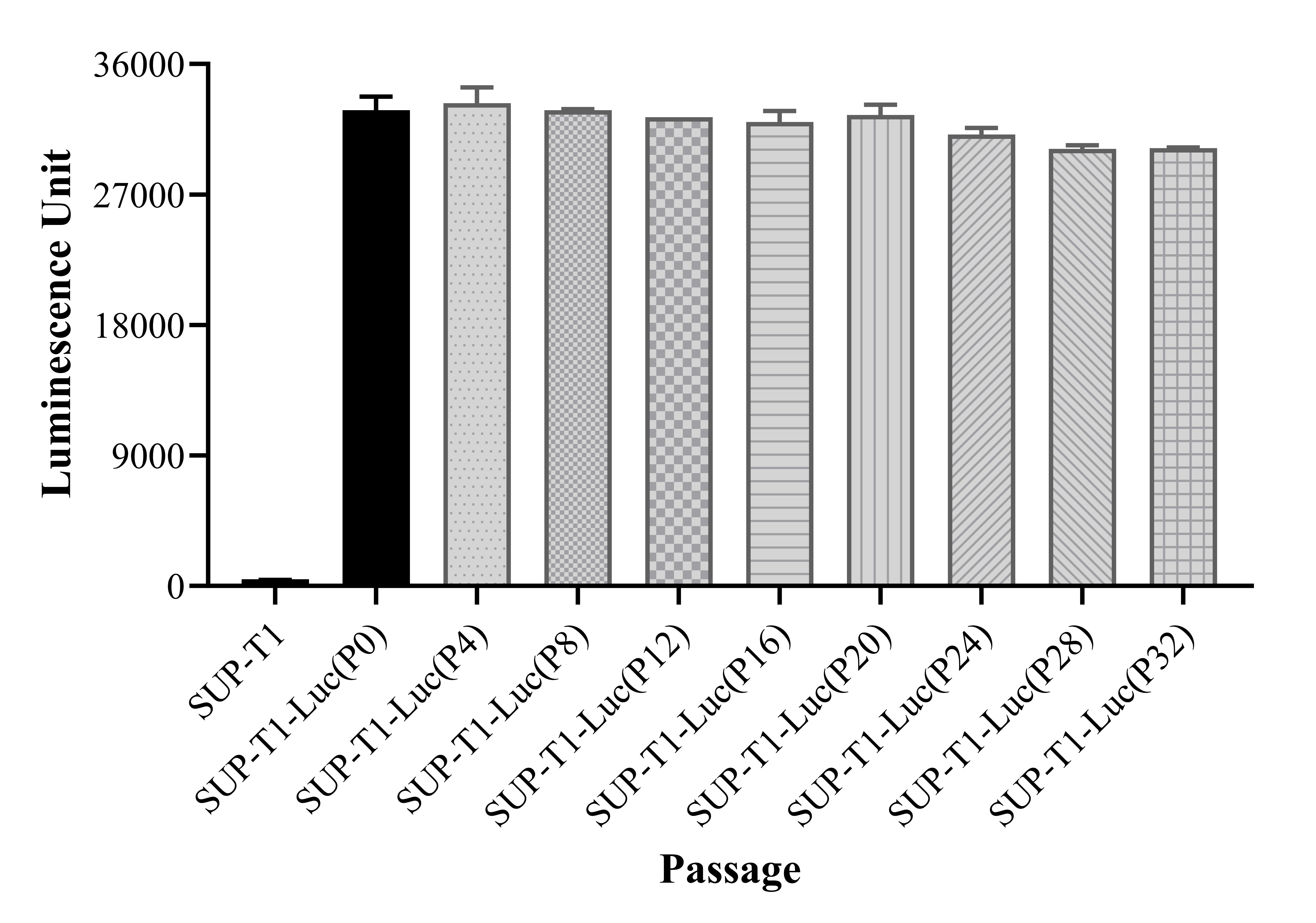 Figure 1. Stablity test results. SUP-T1-Luc showed at least 32 passage stability with similar luminescence unit. |