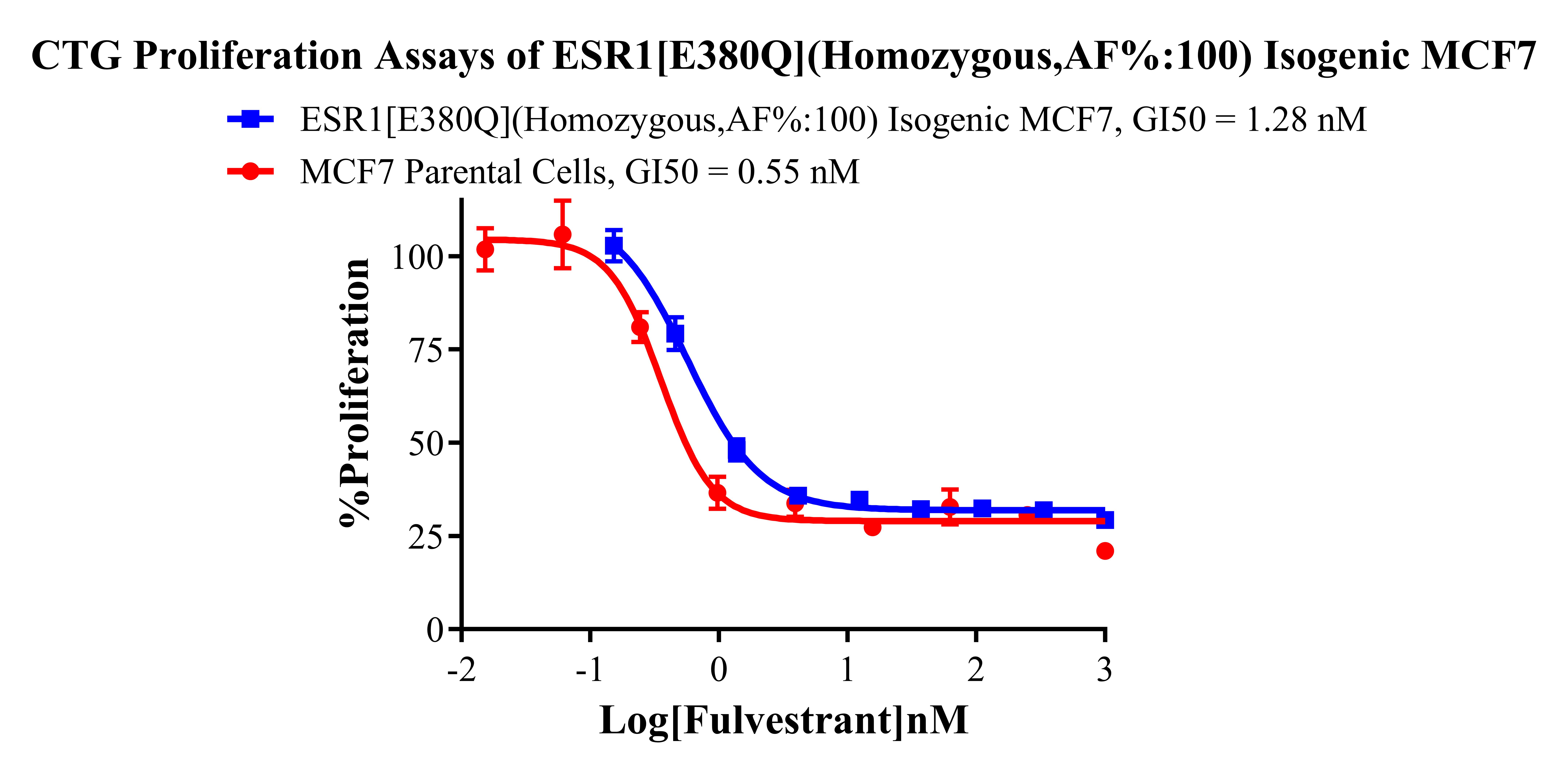 ![]() Figure 1. A: MCF7 Parental Cell;B:ESR1[E380Q] (Homozygous,AF%:100) Isogenic MCF7 通道2 藍色微滴代表ESR1[E380Q]突變陽(yáng)性,通道2 綠色微滴代表該位點(diǎn)為陰性野生型 ![]() Figure 2. CTG Proliferation Assays of ESR1[E380Q](Homozygous,AF%:100) Isogenie MCF7. |