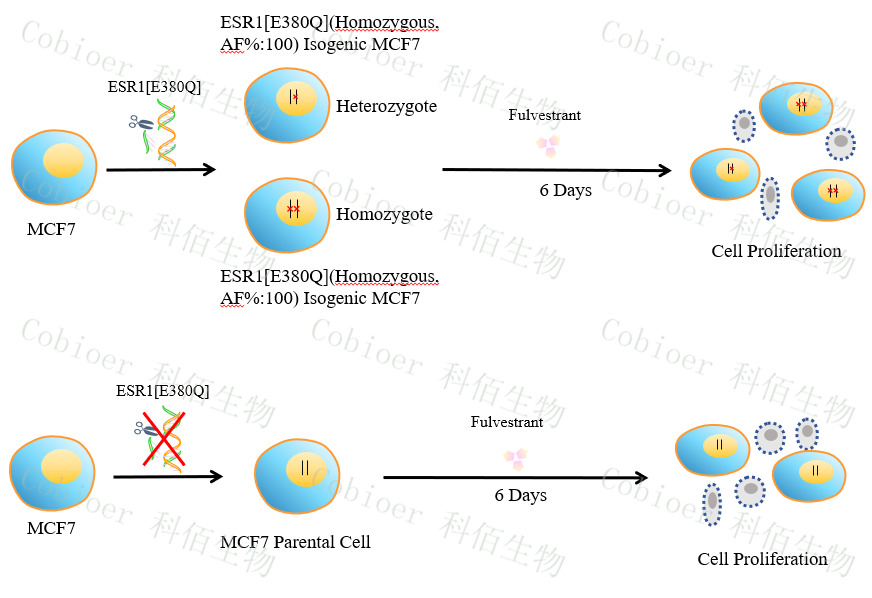 ESR1[E380Q](Homozygous,AF%:100) Isogenic MCF7 藥靶細胞,通過(guò)基因編輯的方式將 ESR1 的 380 位氨基酸谷氨酸(E)突變?yōu)楣劝滨0罚≦)。![]() 圖 1: ESR1[E380Q](Homozygous,AF%:100) Isogenic MCF7 細胞的構建原理圖
