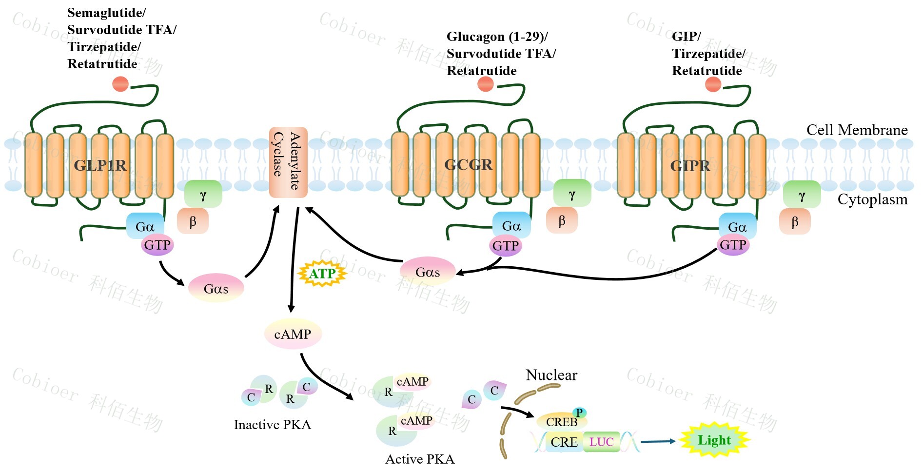 GLP1R&GCGR&GIPR Triple Reporter Cell 報告基因藥靶模型很好的模擬了體內GLP1R&GCGR&GIPR 的信號轉導過(guò)程,原理見(jiàn)圖1 所