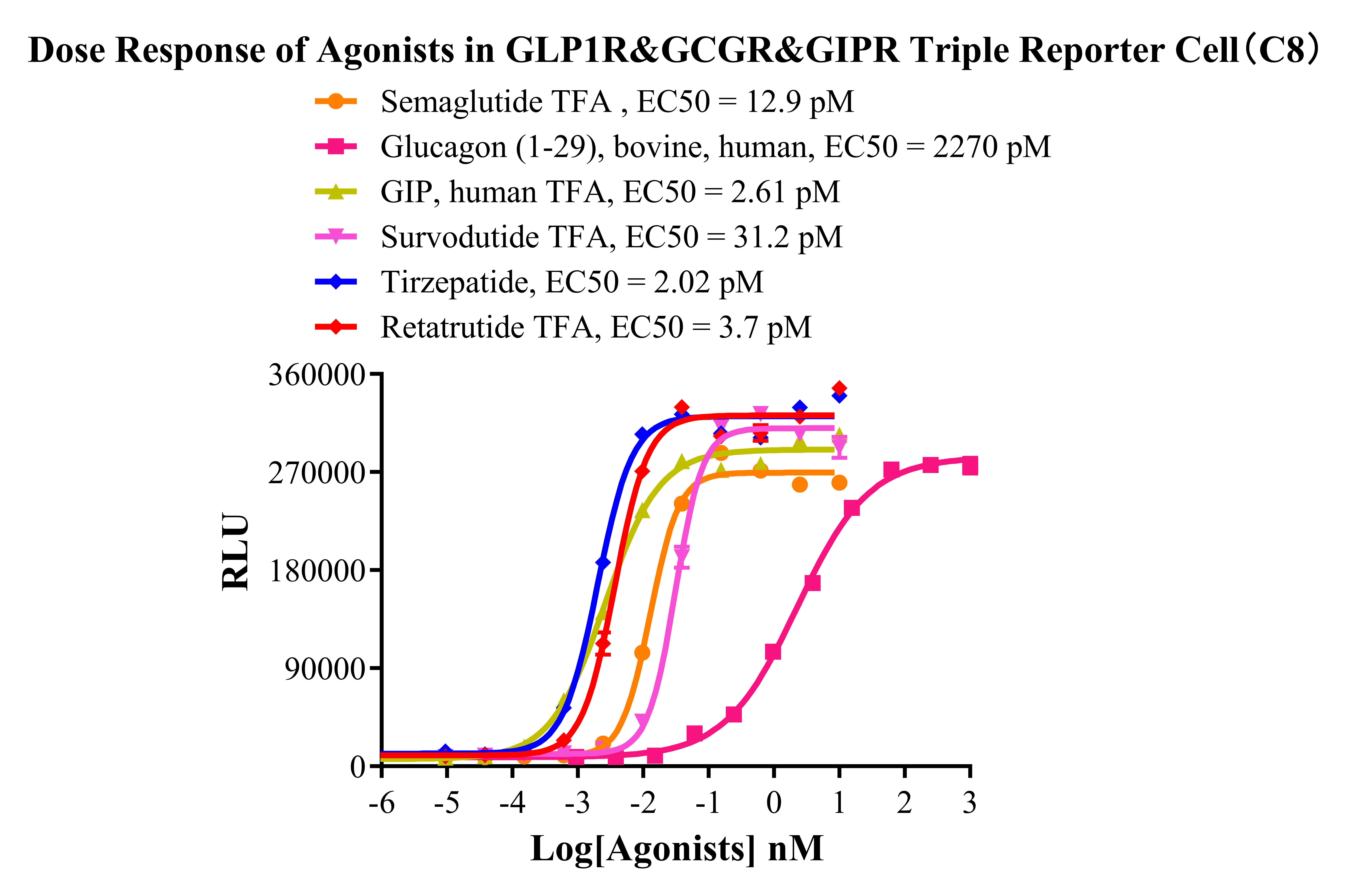 Figure 3. Dose Response of Agonists in GLP1R&GCGR&GIPR Triple Reporter Cell(C8.