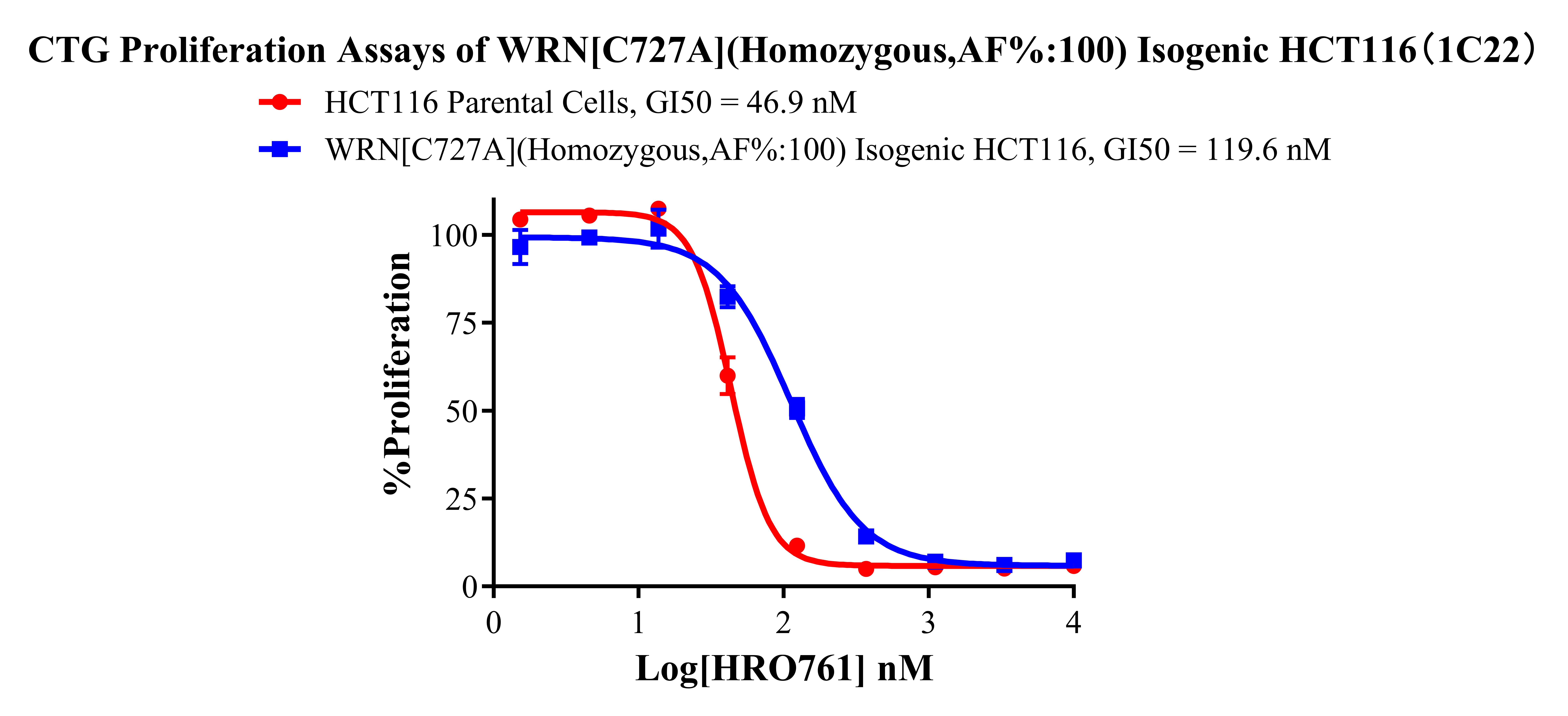 ![]() Figure 1. Sanger of WRN[C727A](Homozygous,AF%:100) Isogenic HCT116 ![]() Figure 2. A:HCT116 Parental Cell;B:WRN[C727A](Homozygous,AF%:100) Isogenic HCT116 通道2 藍色微滴代表WRN[C727A]突變陽(yáng)性,通道2 綠色微滴代表該位點(diǎn)為陰性野生型 ![]() Figure 3. CTG Proliferation Assays of WRN[C727A](Homozygous,AF%:100) Isogenic HCT116(1C22). ![]() Figure 4. CTG Proliferation Assays of WRN[C727A](Homozygous,AF%:100) Isogenic HCT116(1C22). |