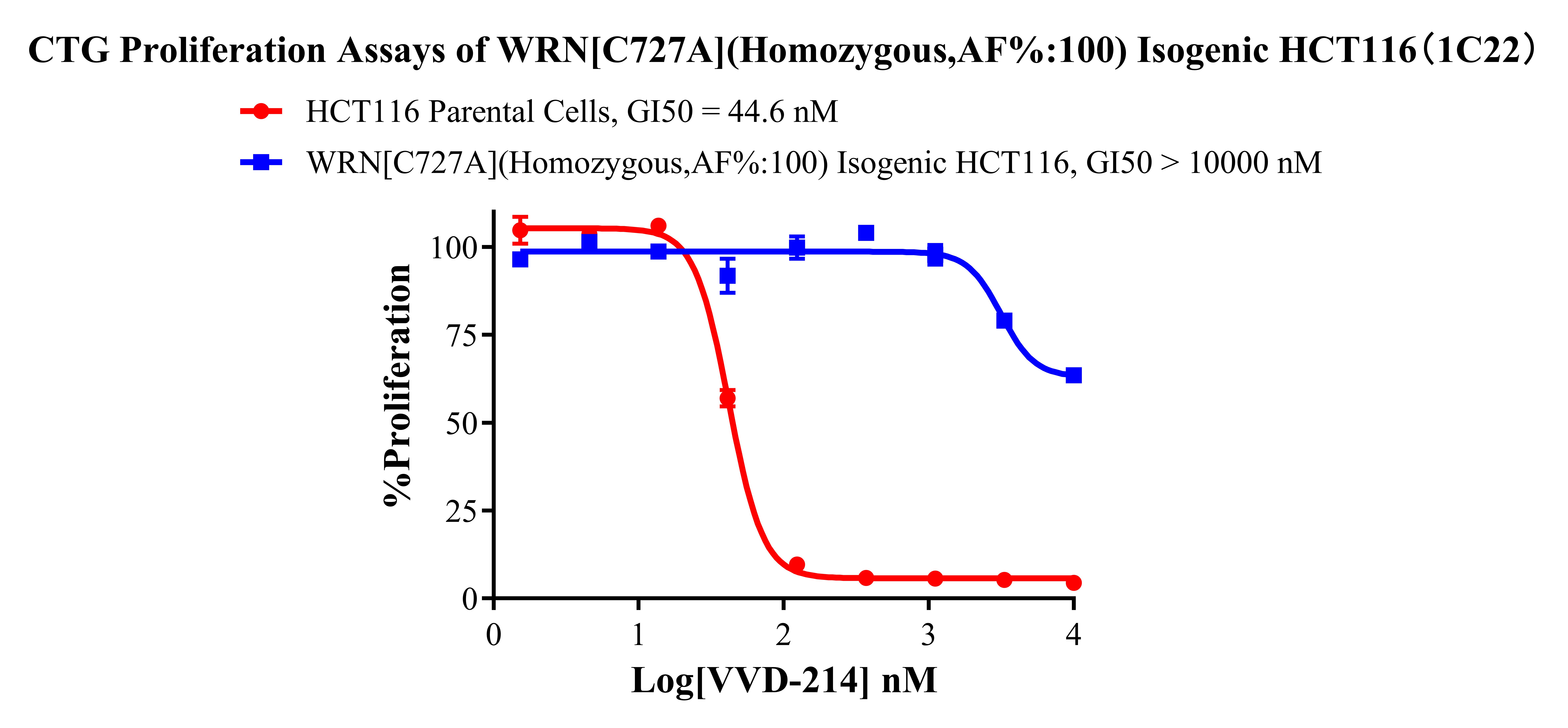 WRN[C727A](Homozygous,AF%:100) Isogenic HCT116 藥靶細胞,通過(guò) 基因編輯的方式將 WRN 的 727 位氨基酸胱氨酸(C)突變?yōu)楸彼幔ˋ)。![]() Figure 1. WRN[C727A](Homozygous,AF%:100) Isogenic HCT116 原理示意圖 |