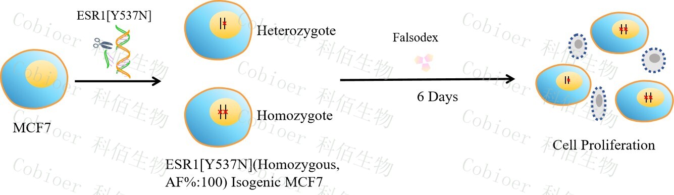 ESR1[Y537N](Homozygous,AF%:100) Isogenic MCF7 藥靶細胞,通過(guò)基 因編輯的方式將 ESR1 的 537 位氨基酸酪氨酸(Y)突變?yōu)樘於0罚∟)。![]() Figure 1. ESR1[Y537N](Homozygous,AF%:100) Isogenic MCF7 原理示意圖 |