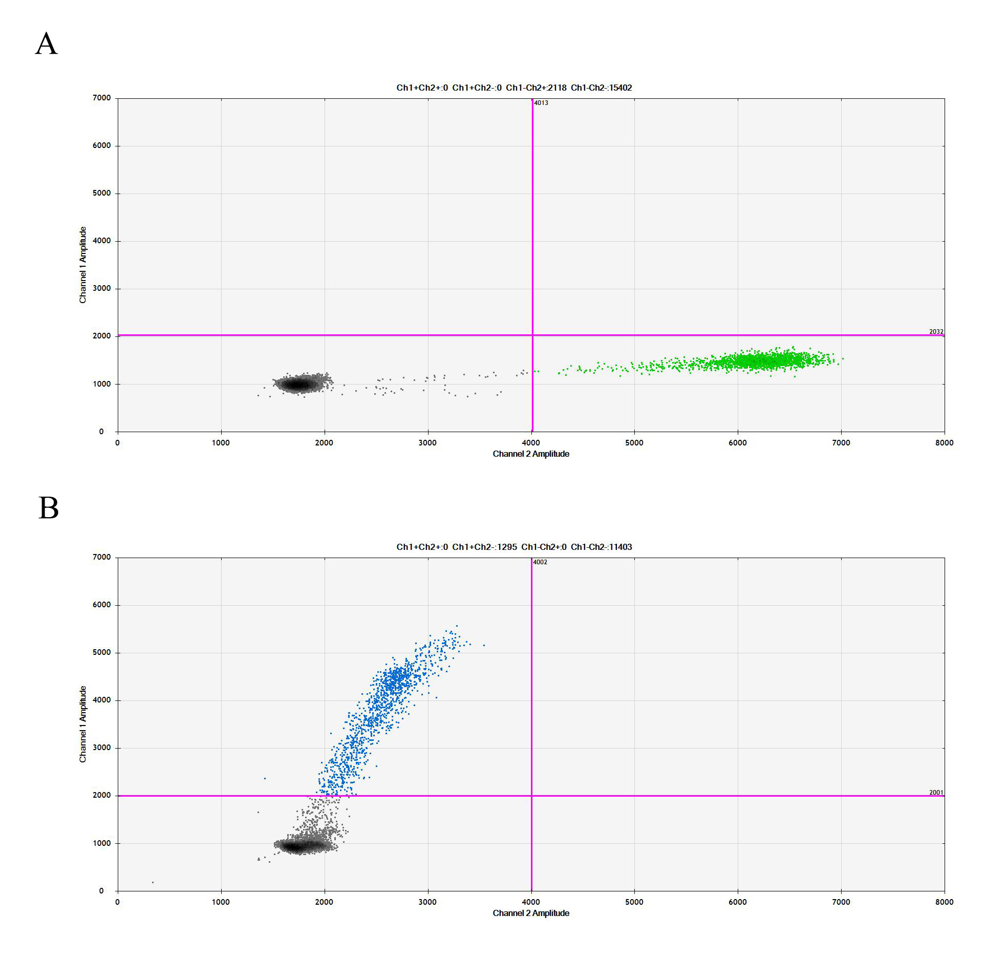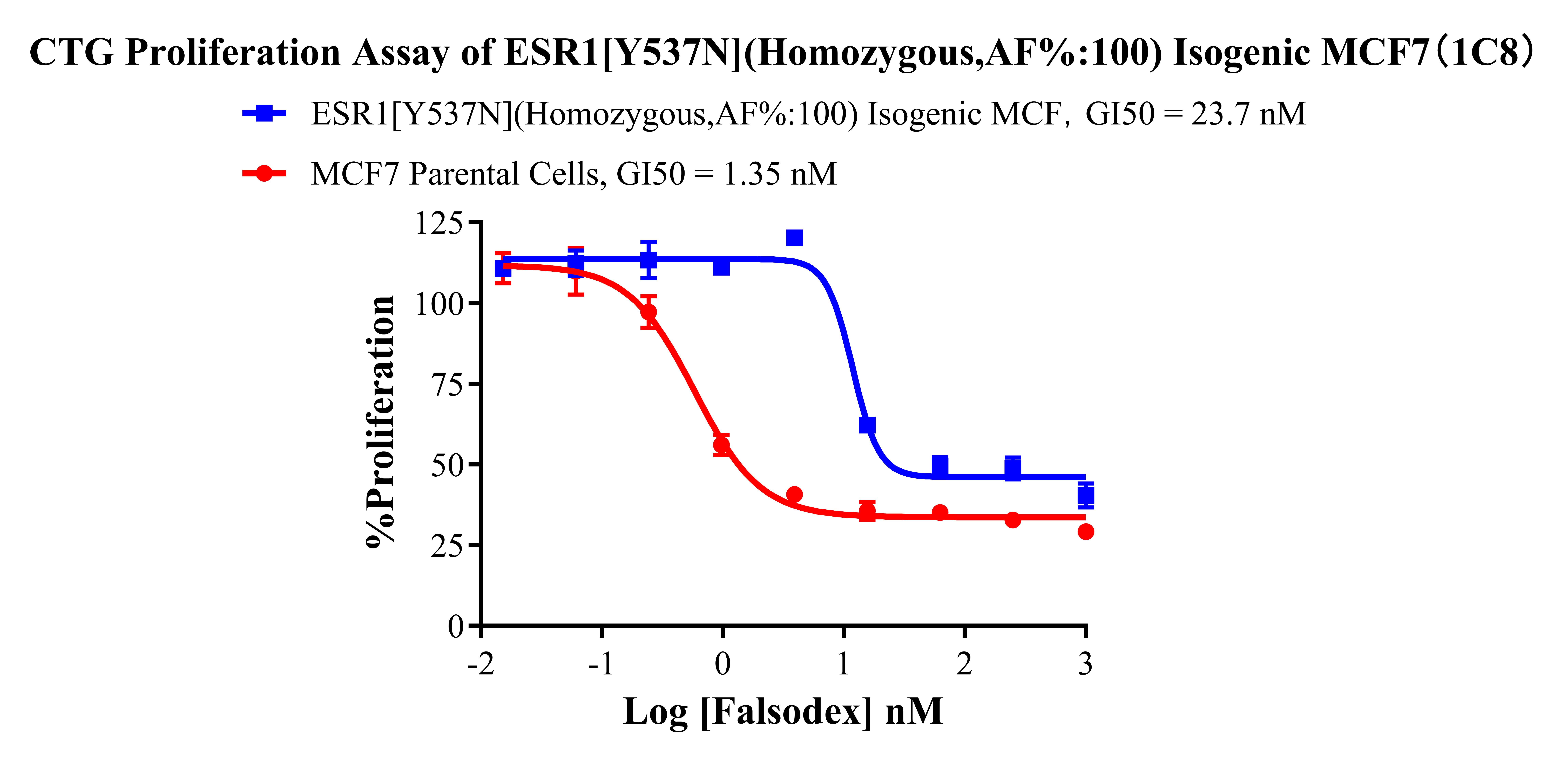 ![]() Figure 2. Sanger of ESR1[Y537N](Homozygous,AF%:100) Isogenic MCF7. ![]() Figure 3. A:MCF7 Parental Cell;B:ESR1[Y537N](Homozygous,AF%:100) Isogenic MCF7 通道2 藍色微滴代表ESR1[Y537N]突變陽(yáng)性,通道2 綠色微滴代表該位點(diǎn)為陰性野生型 ![]() Figure 4. CTG Proliferation Assay of ESR1[Y537N(Homozygous,AF%:100) Isogenie MCF7(1C8). |