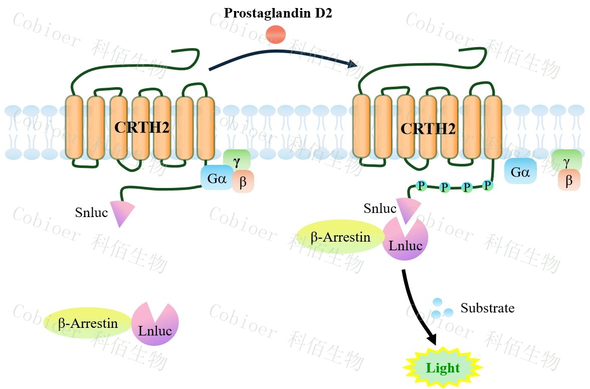 CRTH2(DP2) β-Arrestin CHO 報告基因藥靶模型很好的模擬了體內 CRTH2(DP2)/β- Arrestin 的信號轉導過(guò)程, 原理見(jiàn)下圖所示。 當缺乏配體刺激時(shí) , β-Arrestin 不與 CRTH2(DP2)結合,融合β-Arrestin 的熒光素酶處于失活構象,當 CRTH2(DP2)遭遇配體刺 激時(shí),融合熒光素酶報告基因的β-Arrestin 被招募,使熒光素酶報告基因處于激活狀態(tài),加 入其底物后發(fā)光信號增強。![]() Figure 1. CRTH2(DP2) β-Arrestin CHO 細胞模型原理圖 |