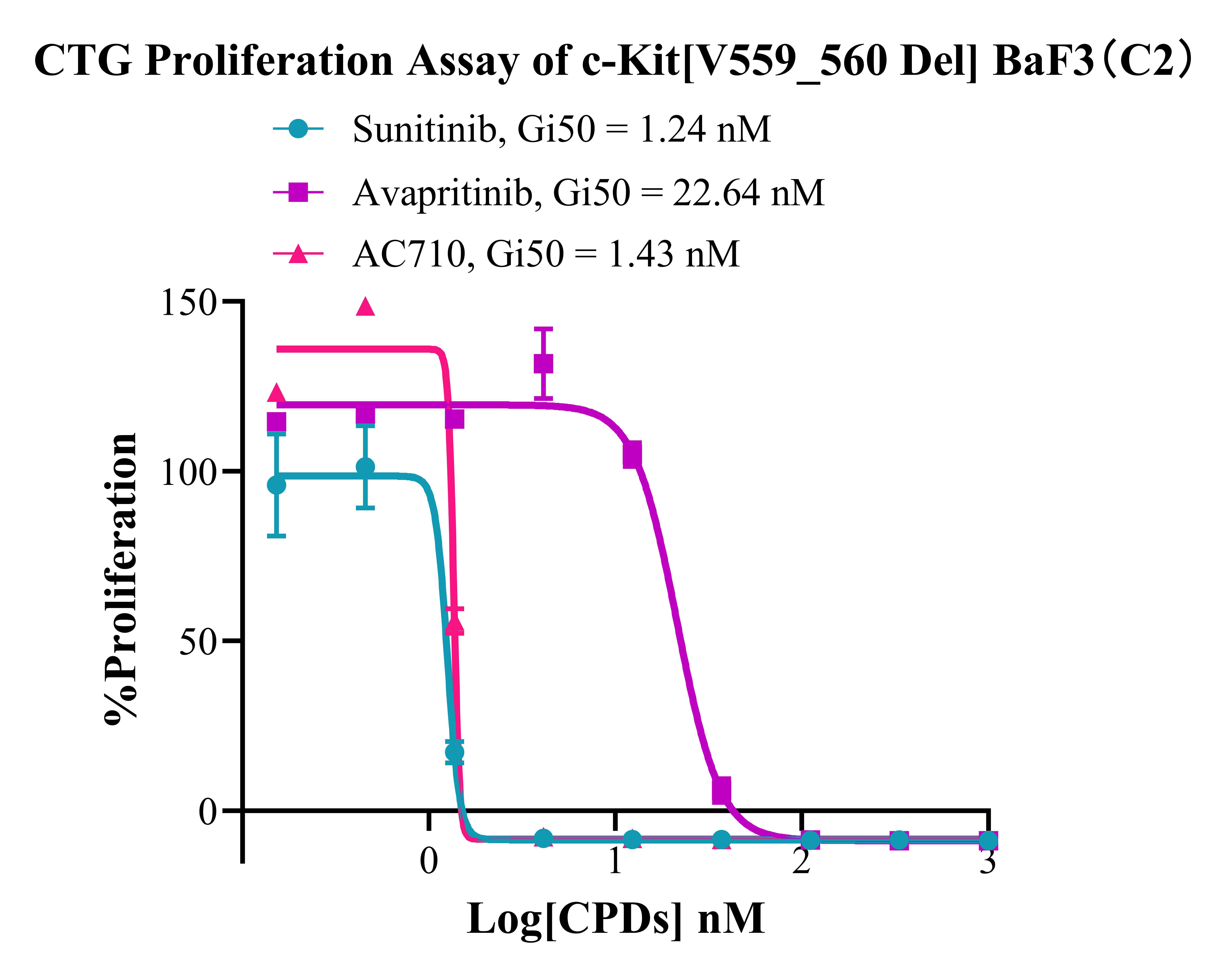 c-Kit[V559_560 Del] BaF3 藥 靶 細 胞 , 通過(guò)轉導缺失狀態(tài)的 c- Kit[V559_560 Del] 基因到 BaF3 細胞系中,穩定表達人缺失形態(tài)下的 c-Kit[V559_560 Del] 基因。