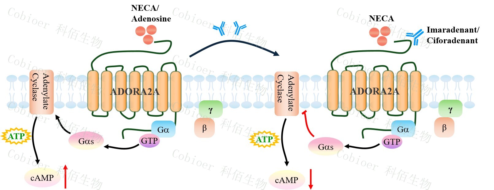 cAMP 在 G 蛋白偶聯(lián)受體(GPCR)信號轉導中是一種關(guān)鍵的第二信使。當配體結合 到 GPCR,構象發(fā)生變化,激活受體接著(zhù)激活 G 蛋白,Gs 的激活導致腺苷酸環(huán)化酶調控 cAMP 的升高。