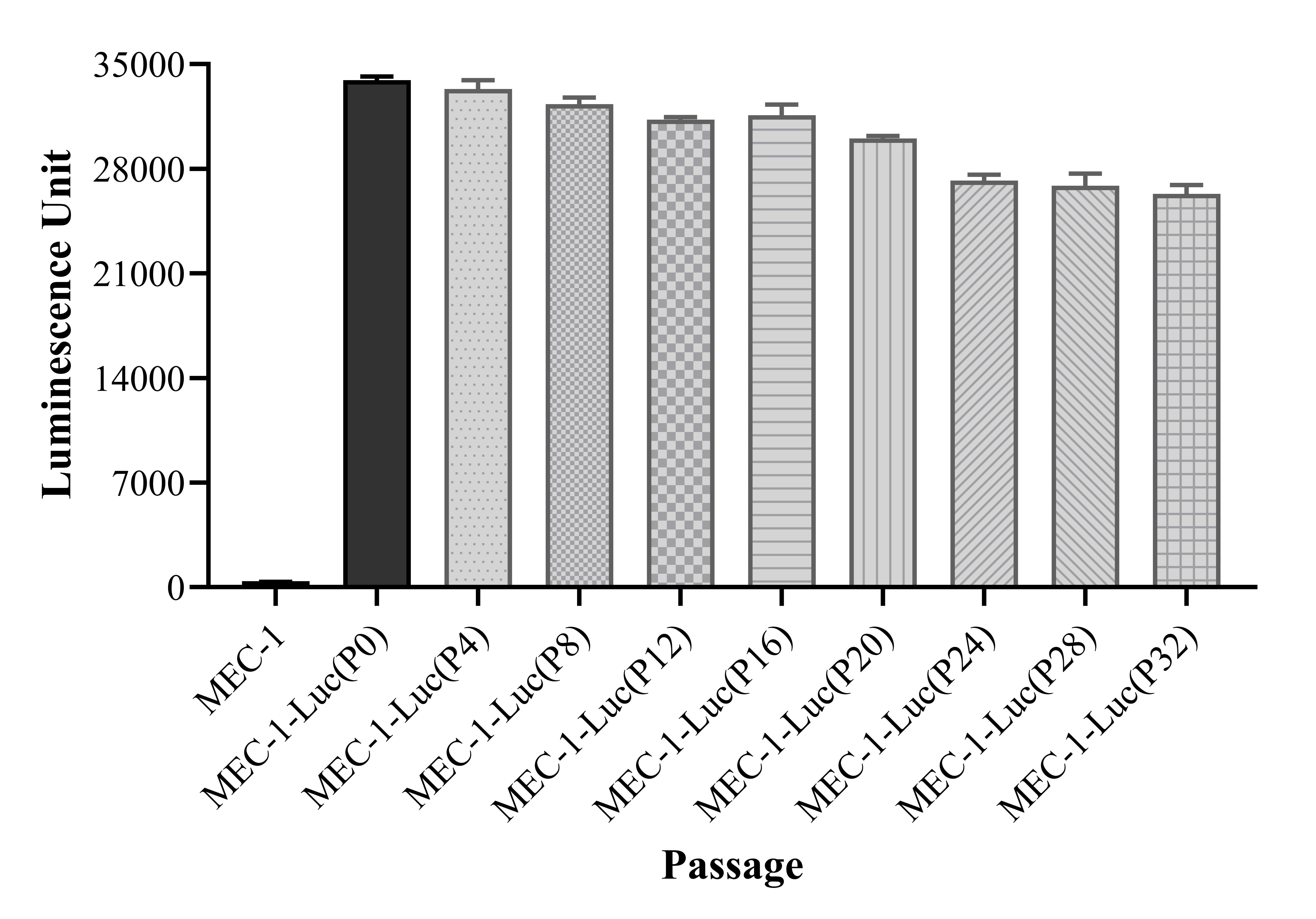 Figure 1. Stablity test results. MEC-1-Luc showed at least 32 passage stability with similar luminescence unit. |