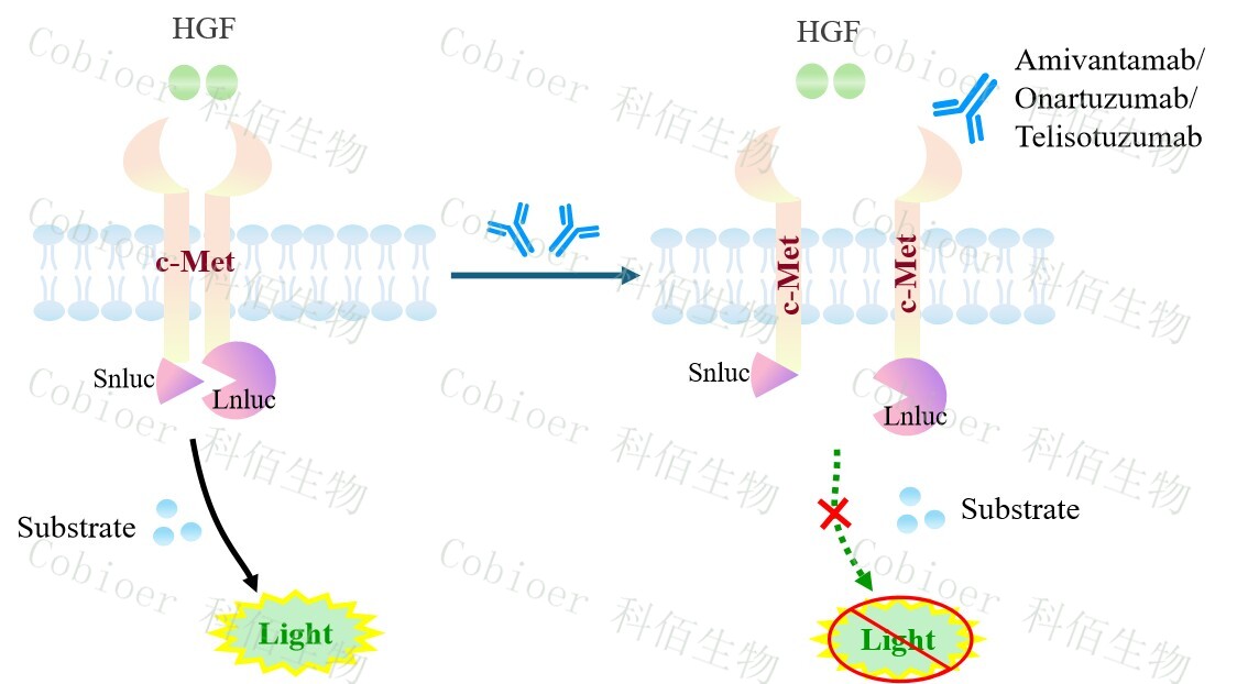 MET Dimerization CHO 報告基因藥靶模型很好的模擬了體內 MET 的信號轉導過(guò)程, 原理見(jiàn)下圖所示。![]() Figure 1. MET Dimerization CHO 細胞模型原理圖 |