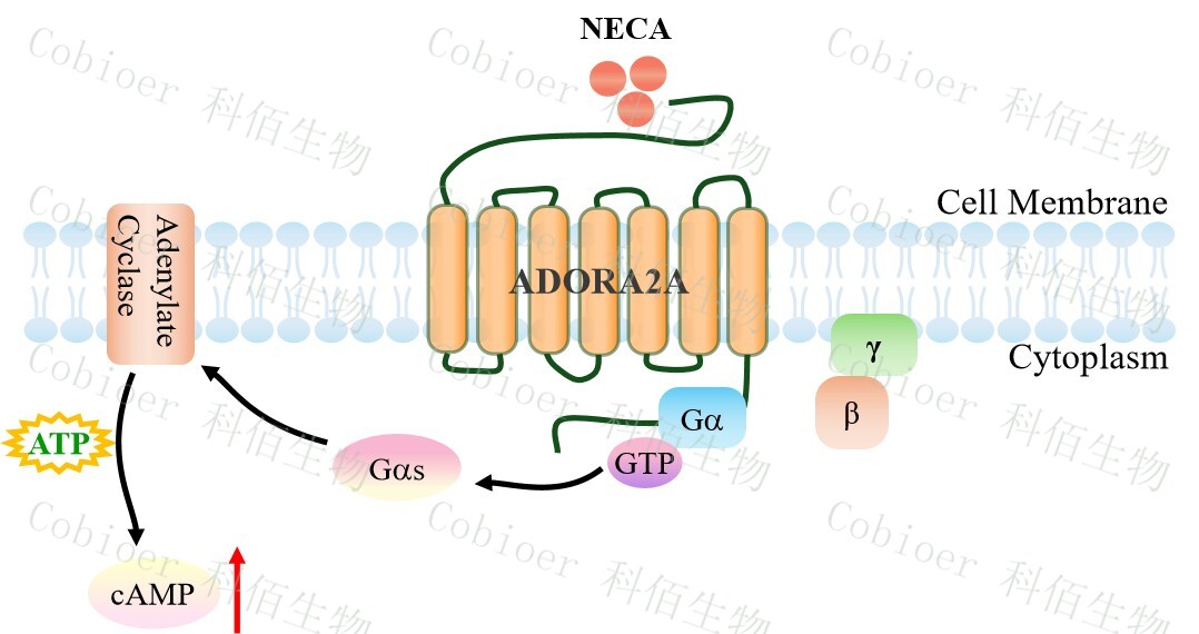 cAMP 在 G 蛋白偶聯(lián)受體(GPCR)信號轉導中是一種關(guān)鍵的第二信使。當配體結合 到 GPCR,構象發(fā)生變化,激活受體接著(zhù)激活 G 蛋白,Gs 的激活導致腺苷酸環(huán)化酶調控 cAMP 的升高。