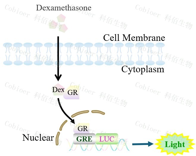 GRE-Luc HEK293 報告基因細胞,是由 GRE 調控并表達 Luc 熒光素酶 報告基因的 HEK293 細胞。Dexamethasone (Hexadecadrol,地塞米松)是糖皮質(zhì)激素受體 (Glucocorticoid Receptor)激動(dòng)劑、凋亡誘導劑,原理見(jiàn)下圖所示。![]() Figure 1. GRE-Luc HEK293 細胞原理示意圖 |