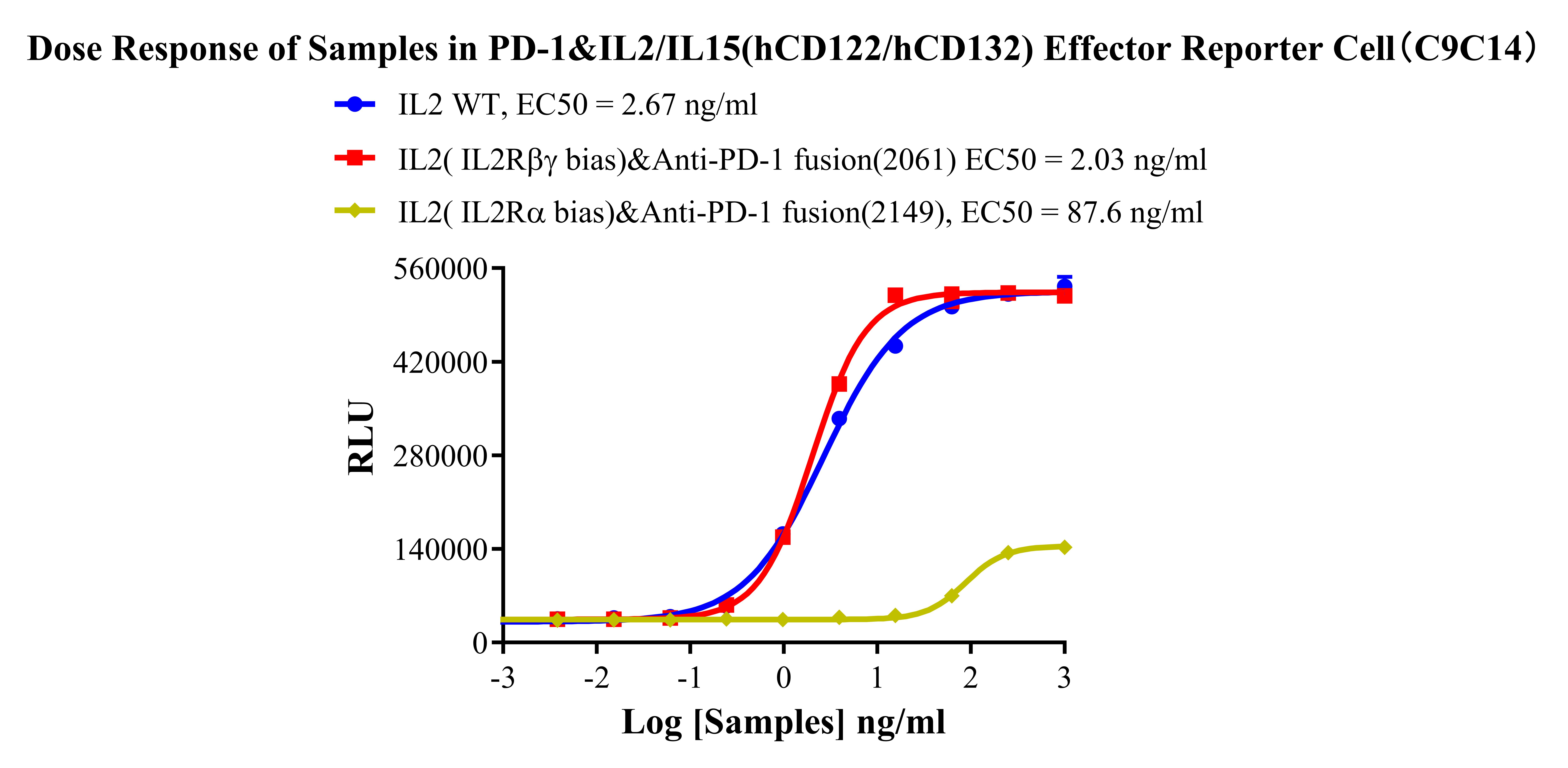 ![]() Figure 3. Dose Response of IL2 (IL2Rα bias)&Anti-PD-1 Fusion in PD-1&IL2/IL15(hCD122/hCD132 Effector Reporter Cell(C9C14) vs IL2/IL15(hCD122/hCD132) Effector Reporter Cell(C9). |