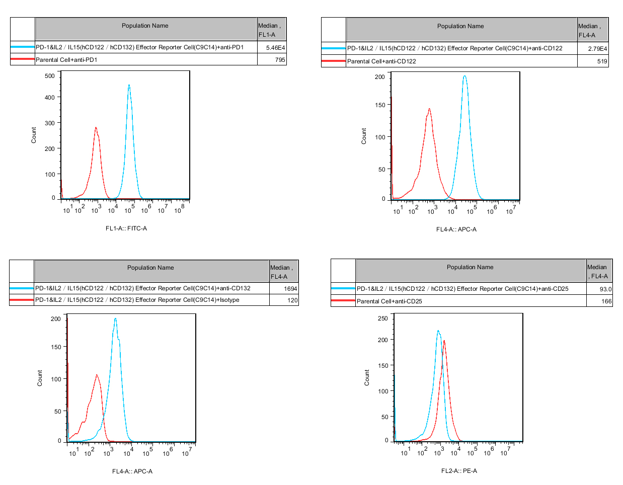 ![]() Figure 1. Recombinant PD-1&IL2/IL15(hCD122/hCD132) Effector Reporter Cell stably expressing PD1&CD122&CD132&CD25. ![]() Figure 2. Dose Response of Samples in PD-1&IL2/IL15(hCD122/hCD132) Effector Reporter Cell(C9C14). |