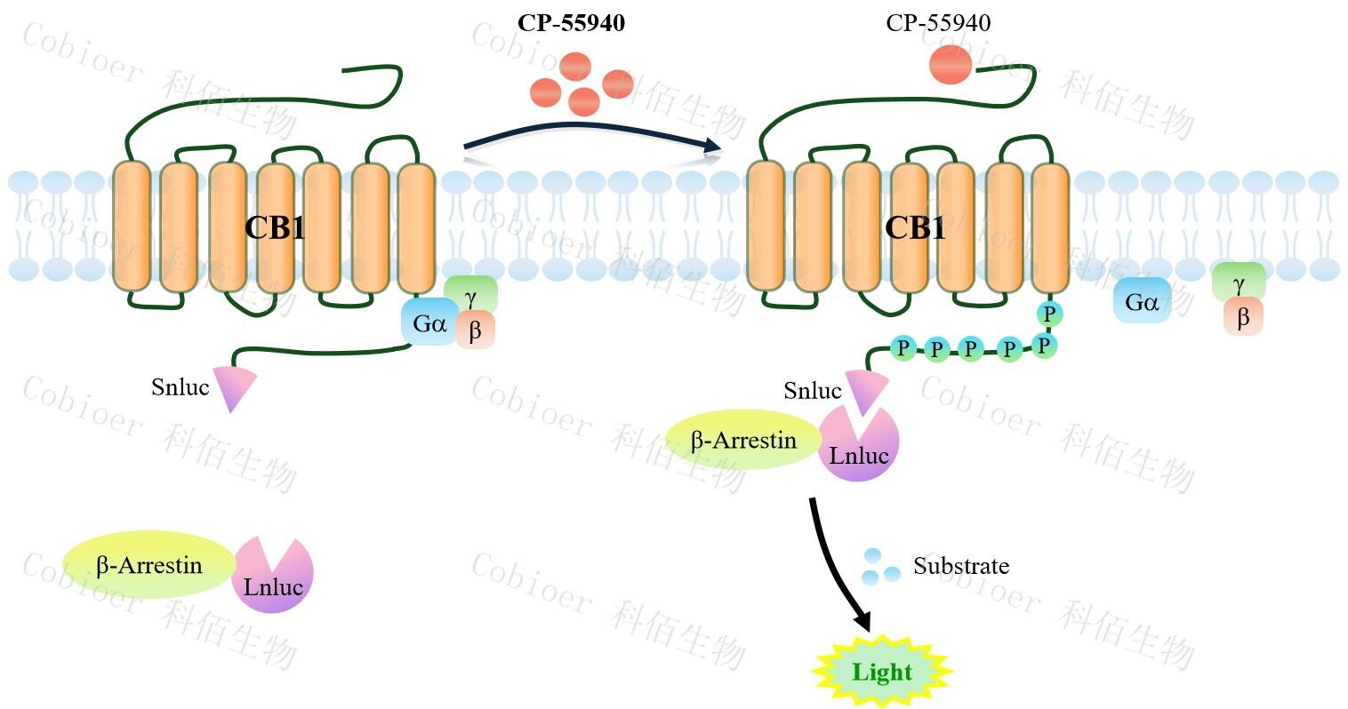 CB1 β-Arrestin CHO 報告基因藥靶模型很好的模擬了體內 CB1/β-Arrestin 的信號轉導過(guò) 程,原理見(jiàn)下圖所示。當缺乏配體刺激時(shí),β-Arrestin 不與 CB1 結合,融合β-Arrestin 的熒 光素酶處于失活構象,當 CB1 遭遇配體刺激時(shí),融合熒光素酶報告基因的β-Arrestin 被招 募,使熒光素酶報告基因處于激活狀態(tài),加入其底物后發(fā)光信號增強。![]() Figure 1. CB1 β-Arrestin CHO 細胞模型原理圖 |